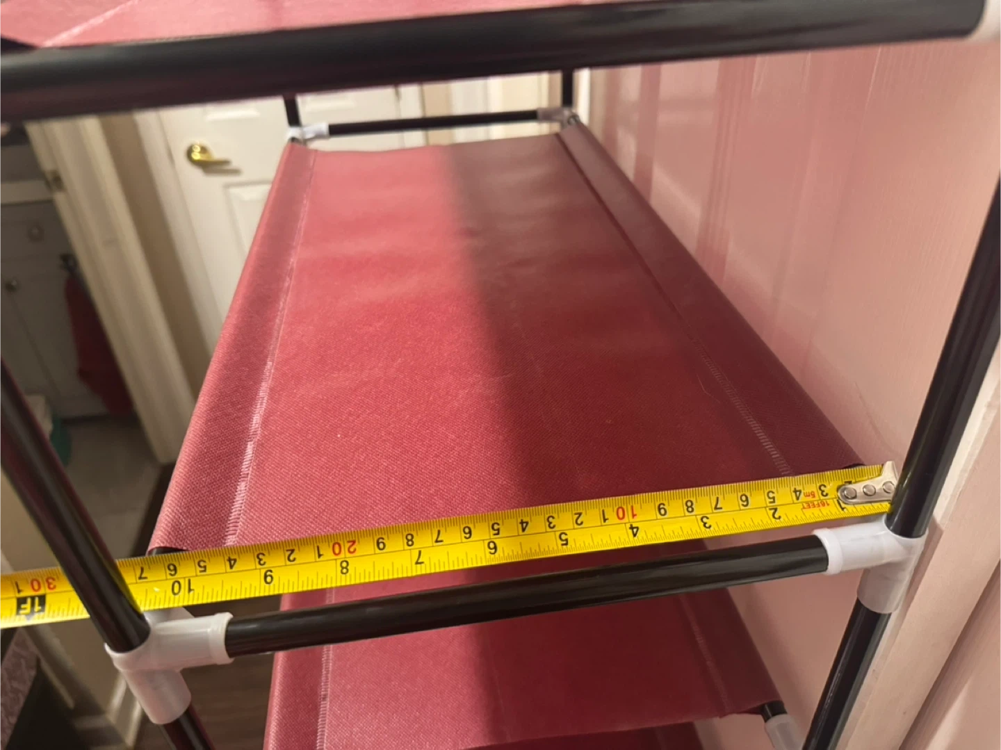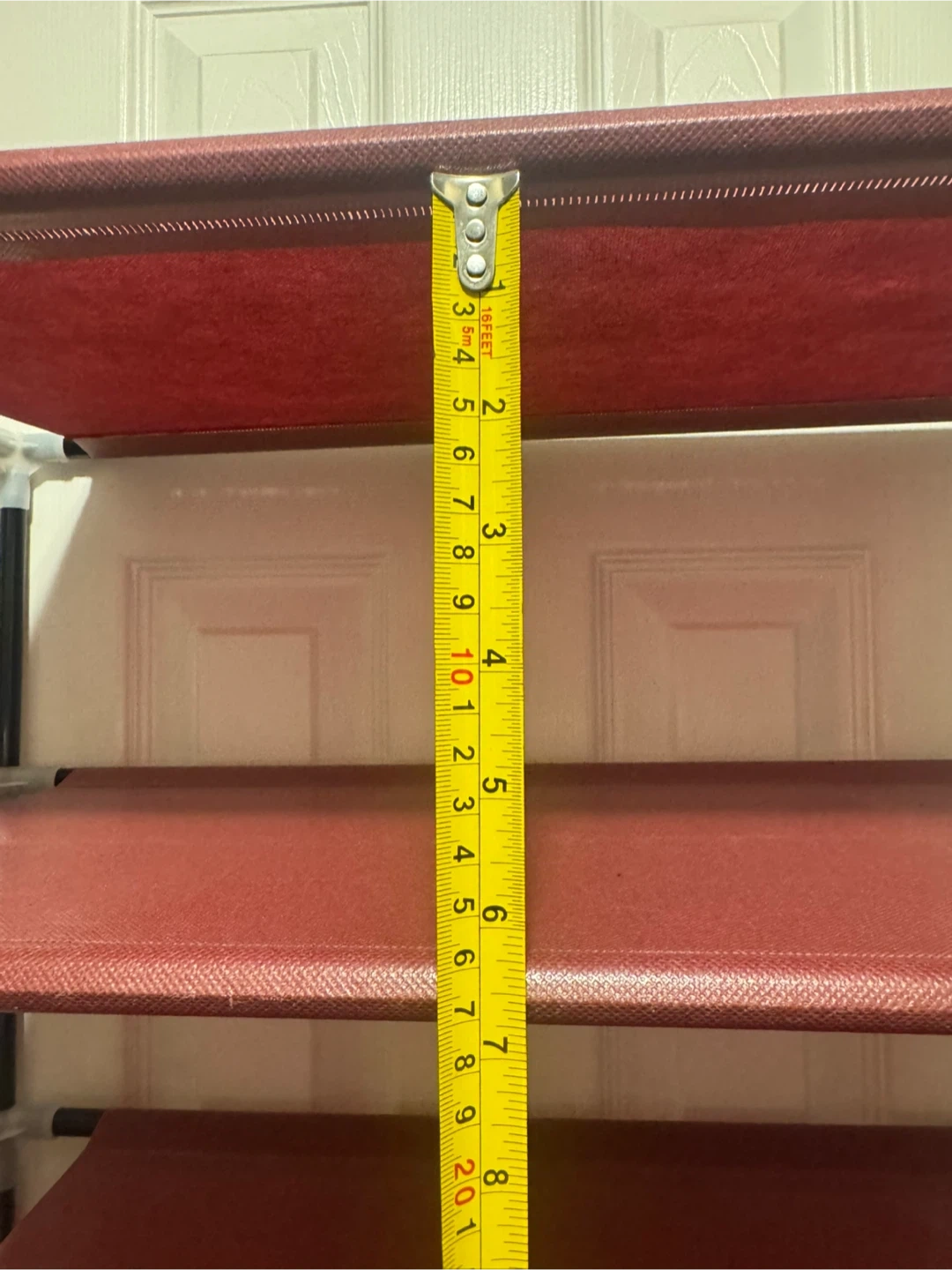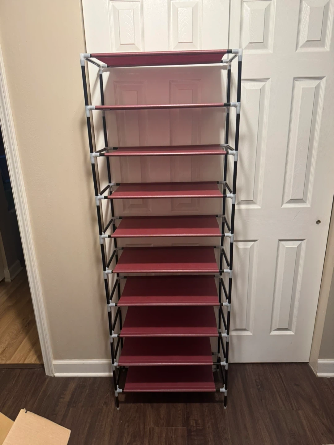 Here's a 10-tier shoe rack organizer! It's in good condition and ready to help you declutter your space. The rack is approximately 23 inches wide and stands about 66 inches tall, with each shelf being around 7 inches deep