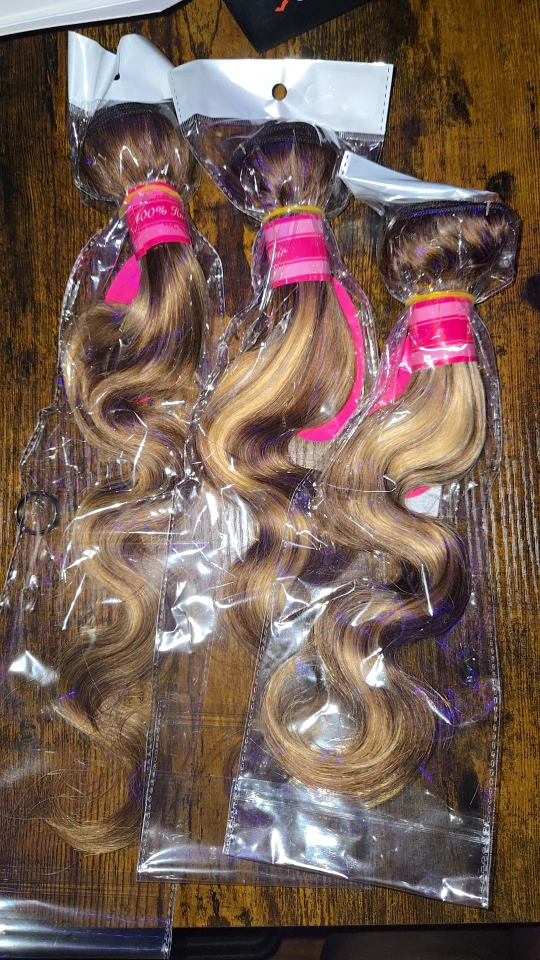 I'm selling some 100% human hair bundles. They are body wave style and come in a mix of brown and blonde tones. They're still in the original packaging and have never been used! Comes with the box