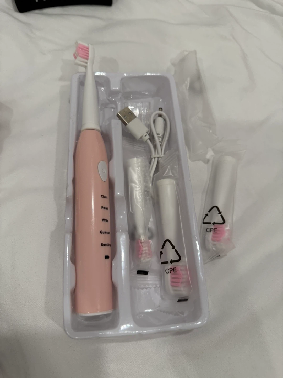 100% new electric toothbrush that comes with its charger and multiple brush heads! It has different settings like Clean, Polish, White, Gumcare, and Sensitive.