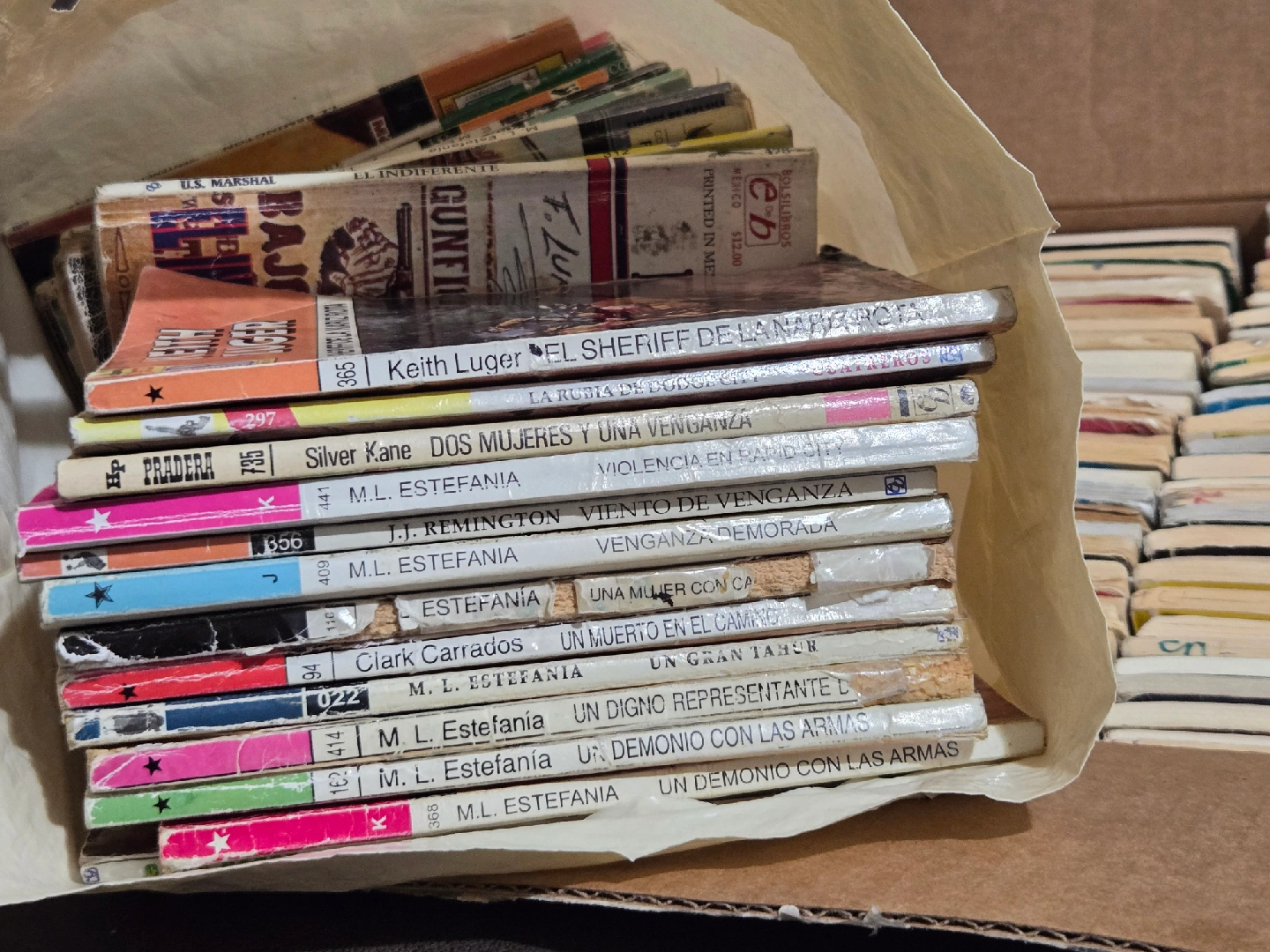A collection of over 100 vintage spanish language western pulp fiction books. Includes "Estefania" series and others. Una colección de más de 100 libros antiguos de ficción pulp del oeste en español. Incluye la serie "Estefanía" y otras.