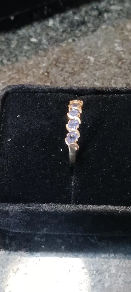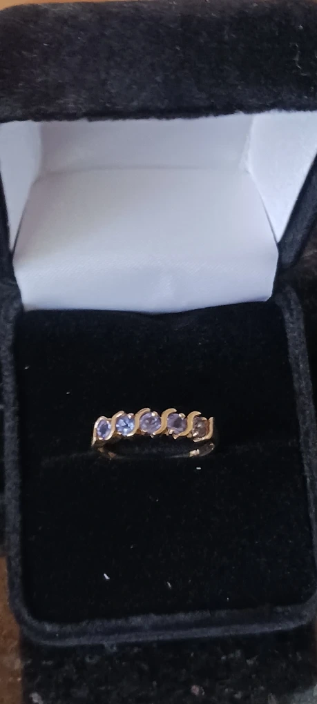 10Selling a beautiful gold ring featuring a row of five light purple stones. It comes in a black velvet box, perfect for gifting or keeping it safe. The ring is in excellent condition and ready to be worn!