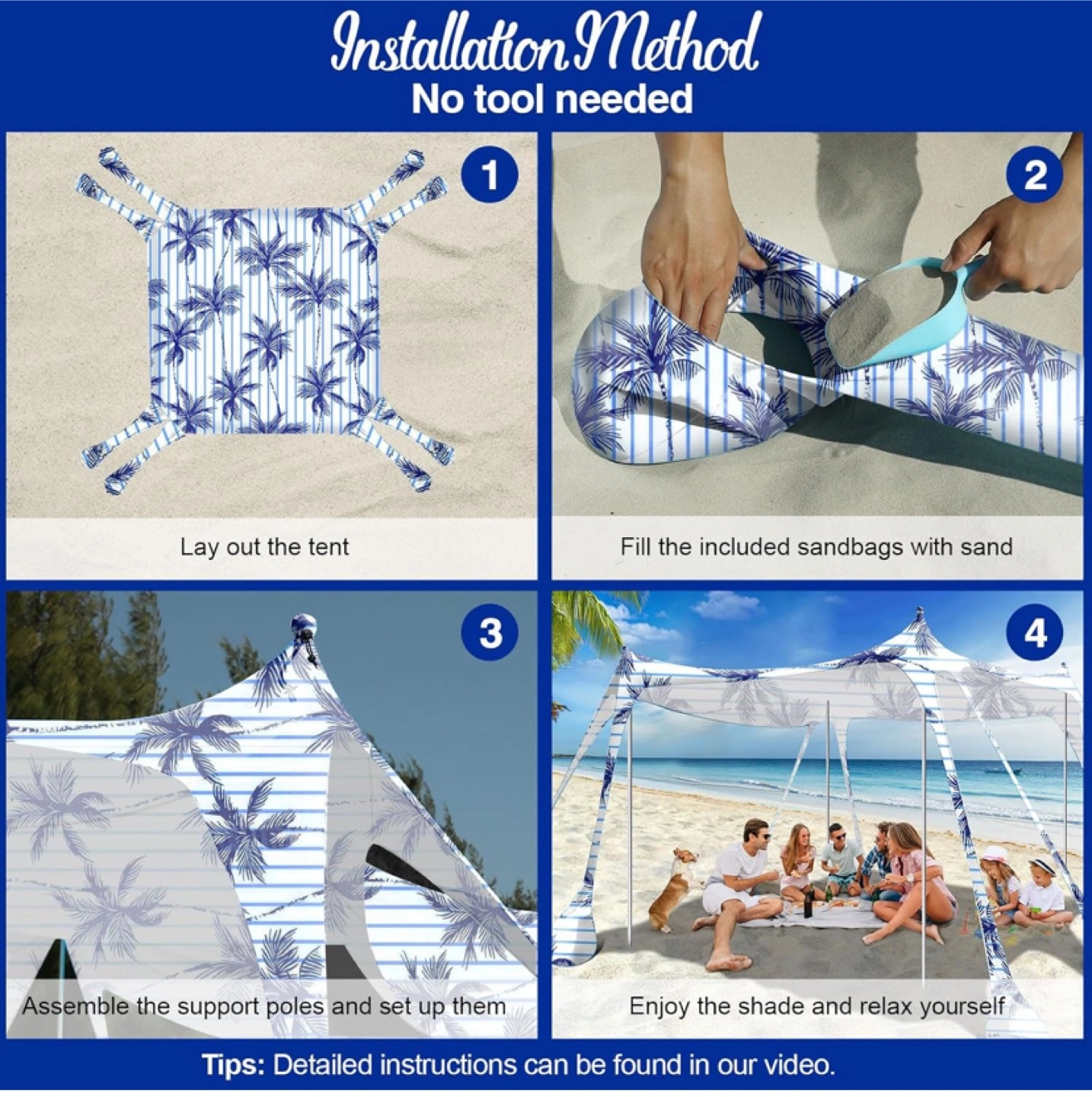 308This beach tent is perfect for relaxing and enjoying the moment! It's lightweight and easy to install, no tools needed. - UPF 50+ effective sun protection - Fits up to 6-8 people - Windproof & stable triangular structure - Upgraded sandbags x8 - Detailed instructions can be found in our video