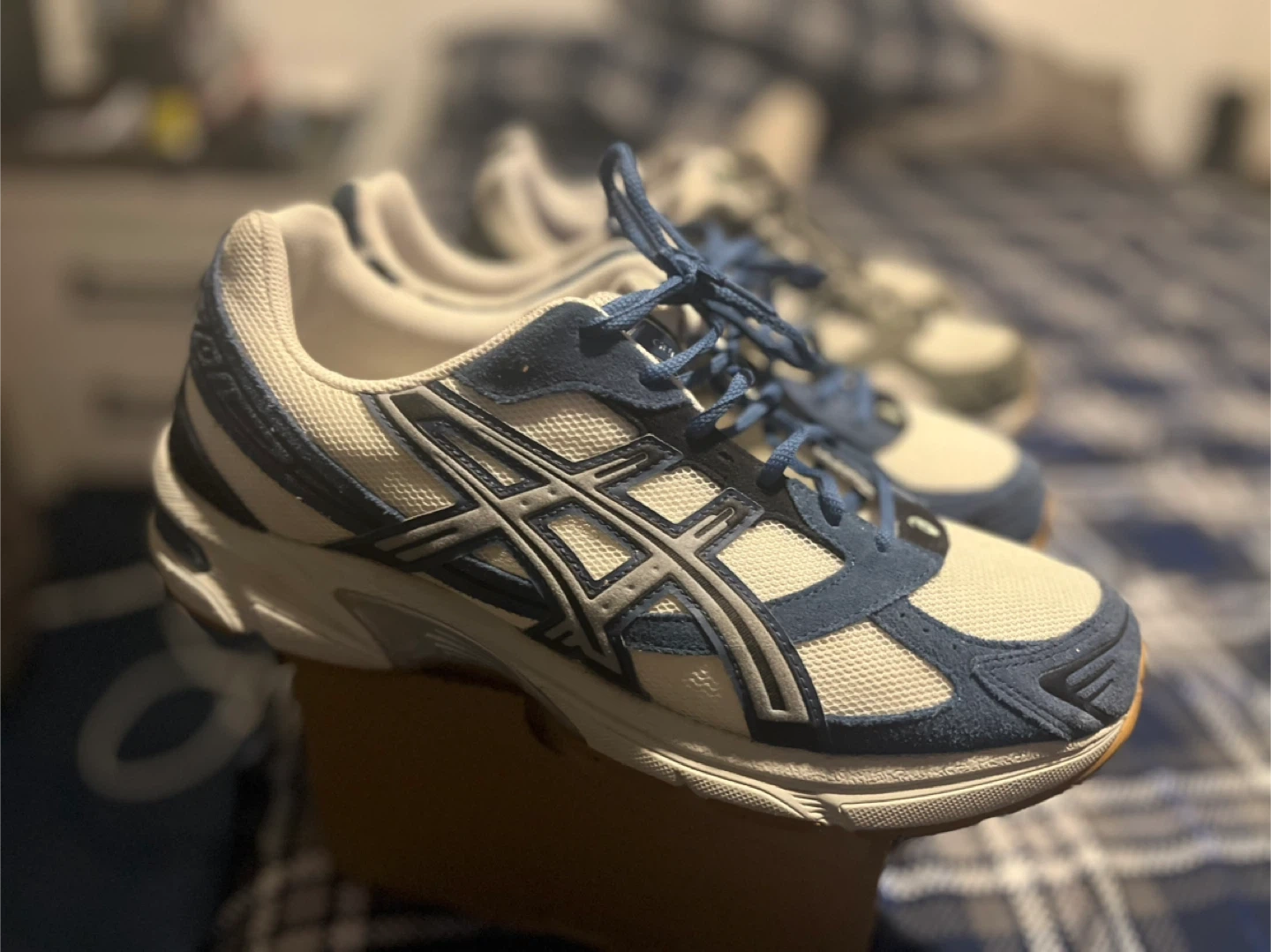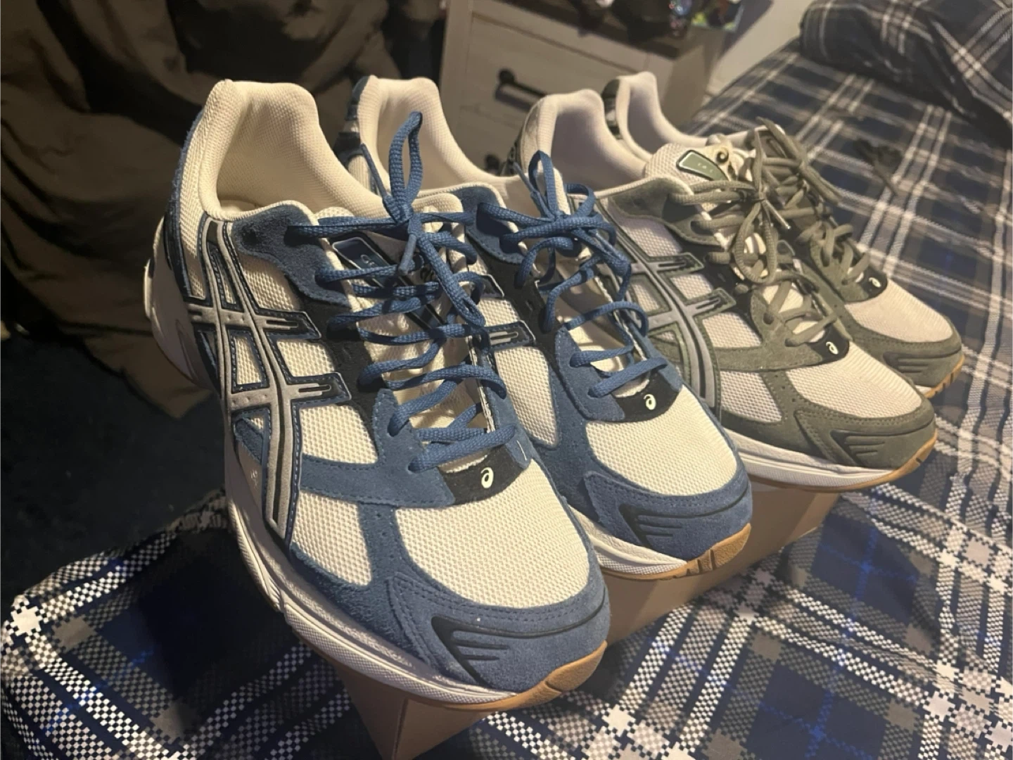 Selling two pairs of Asics Gel-NYC sneakers! One pair is cream and blue, and the other is a light green color. Both are in great condition and ready for a new home. Let me know if you're interested!