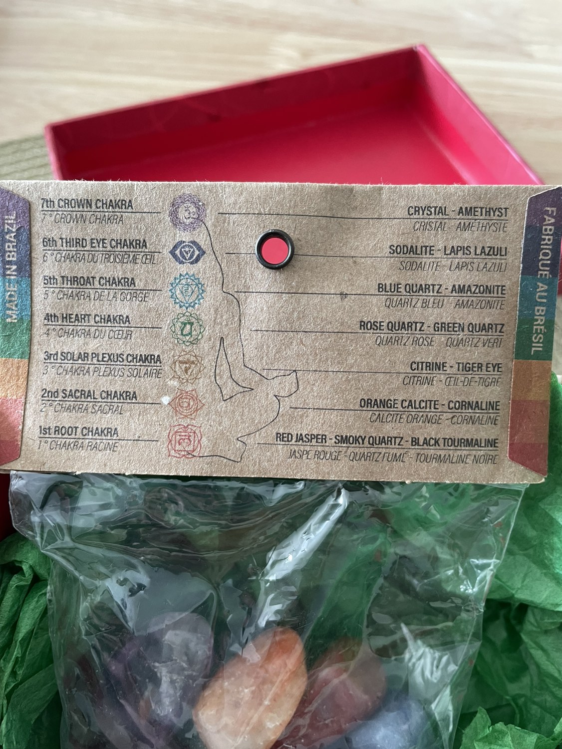 555Set of 7 crystals/gemstones one for each chakra Comes with reusable cute storage box Each crystal is worth about $5 each if bought separately