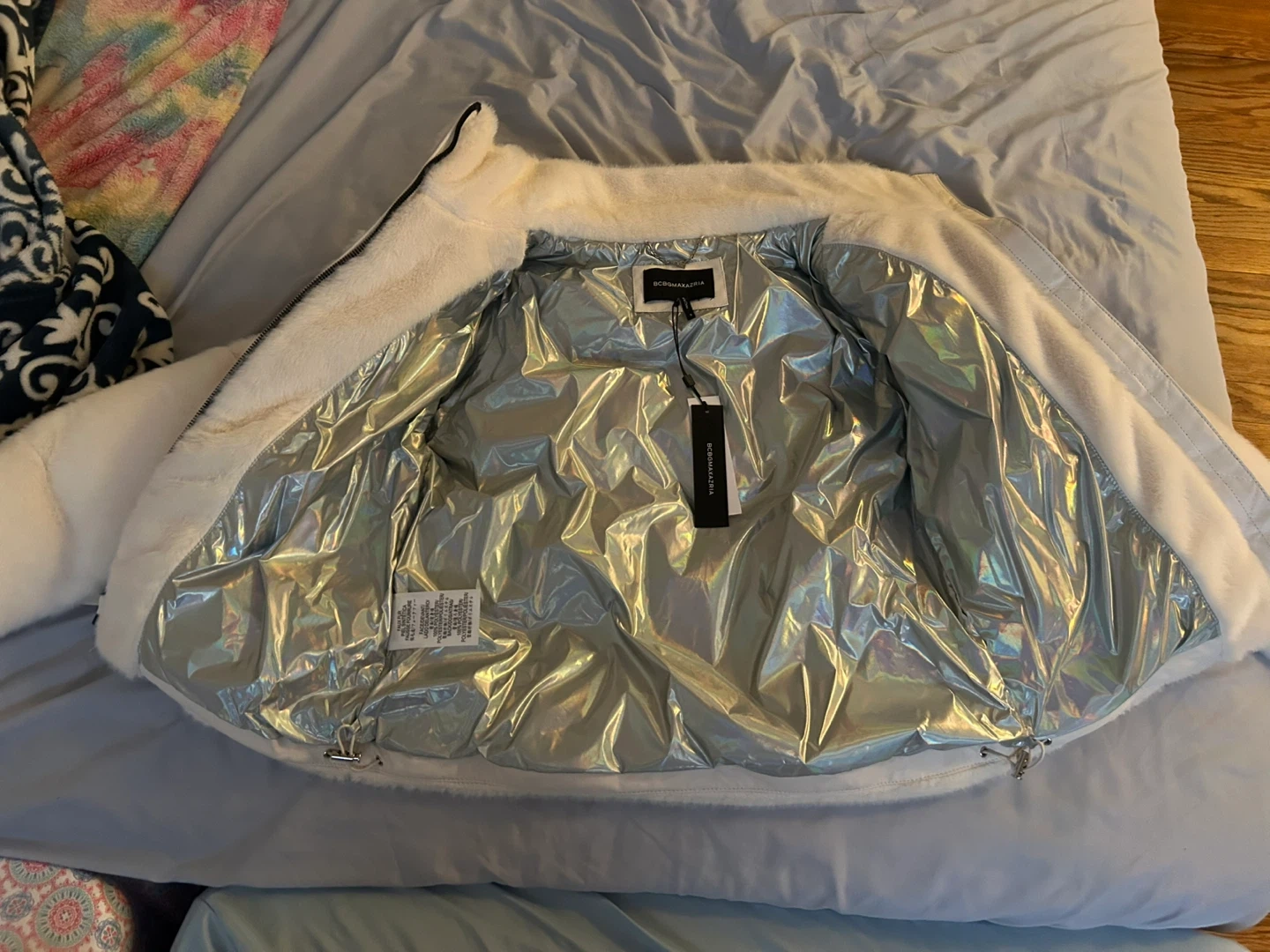 Cozy white puffer jacket with a soft faux fur exterior. It features a shiny silver interior lining and a full zipper closure. This jacket is a stylish and warm option for colder weather!