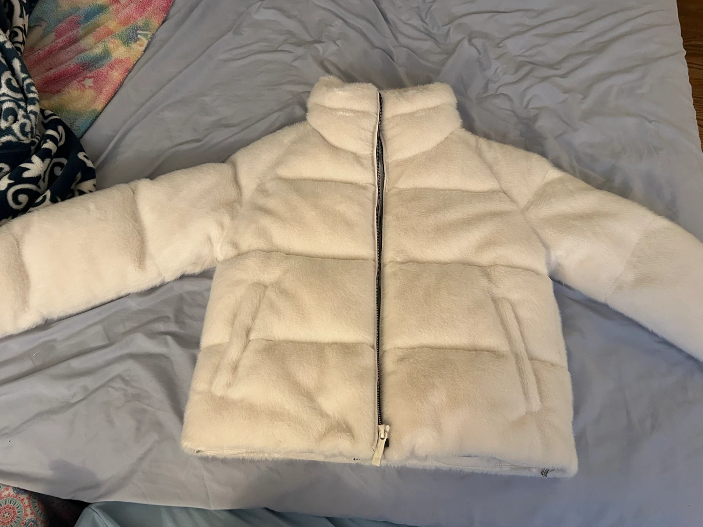 Cozy white puffer jacket with a soft faux fur exterior. It features a shiny silver interior lining and a full zipper closure. This jacket is a stylish and warm option for colder weather!