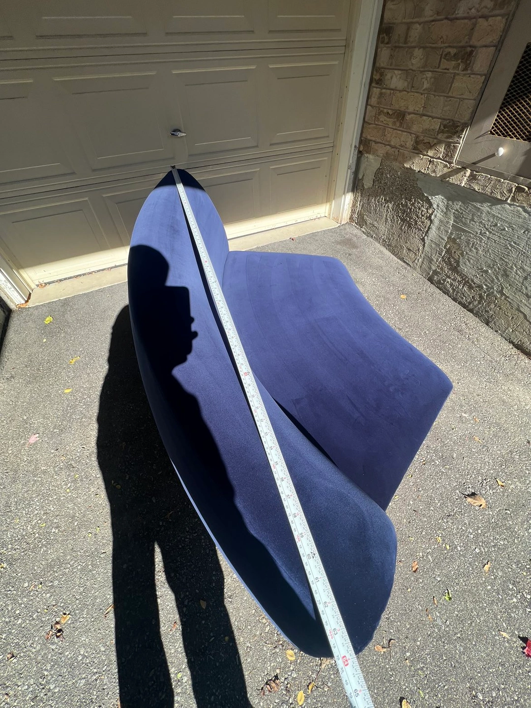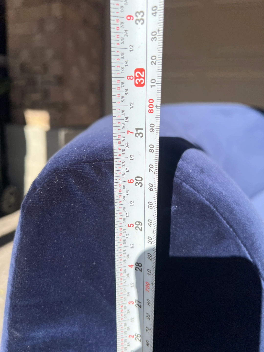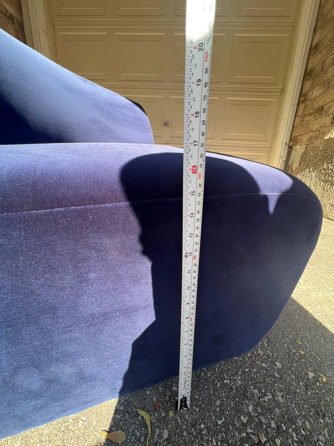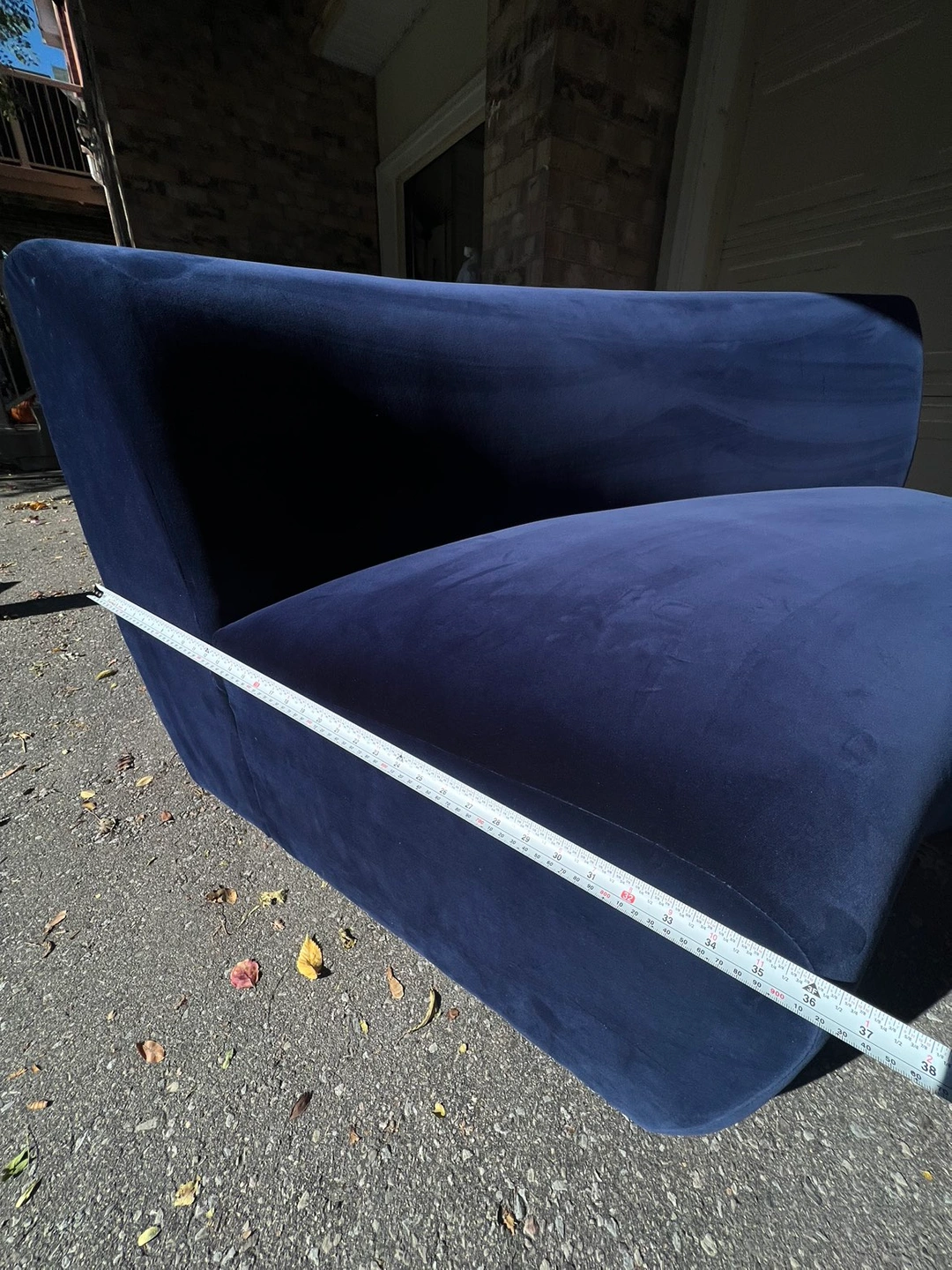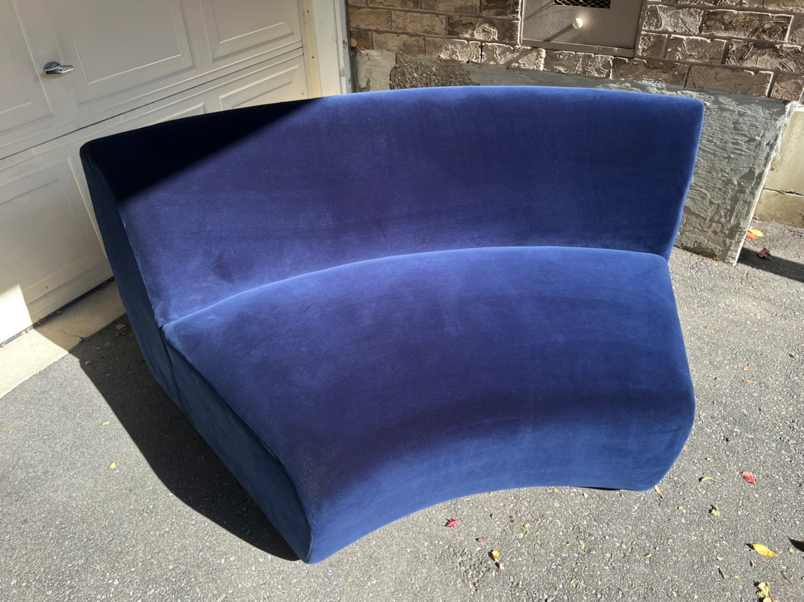 The item does not show any signs of wear and tear, tags are still on sofa. The velvet upholstery provides deeper blue hues against lighter tones as you run your hand against it, smooth through out and structurally sound. Well kept condition from a pet-free, smoke-free, kid-free home. Was not used too much and did not fit well into space after purchase.