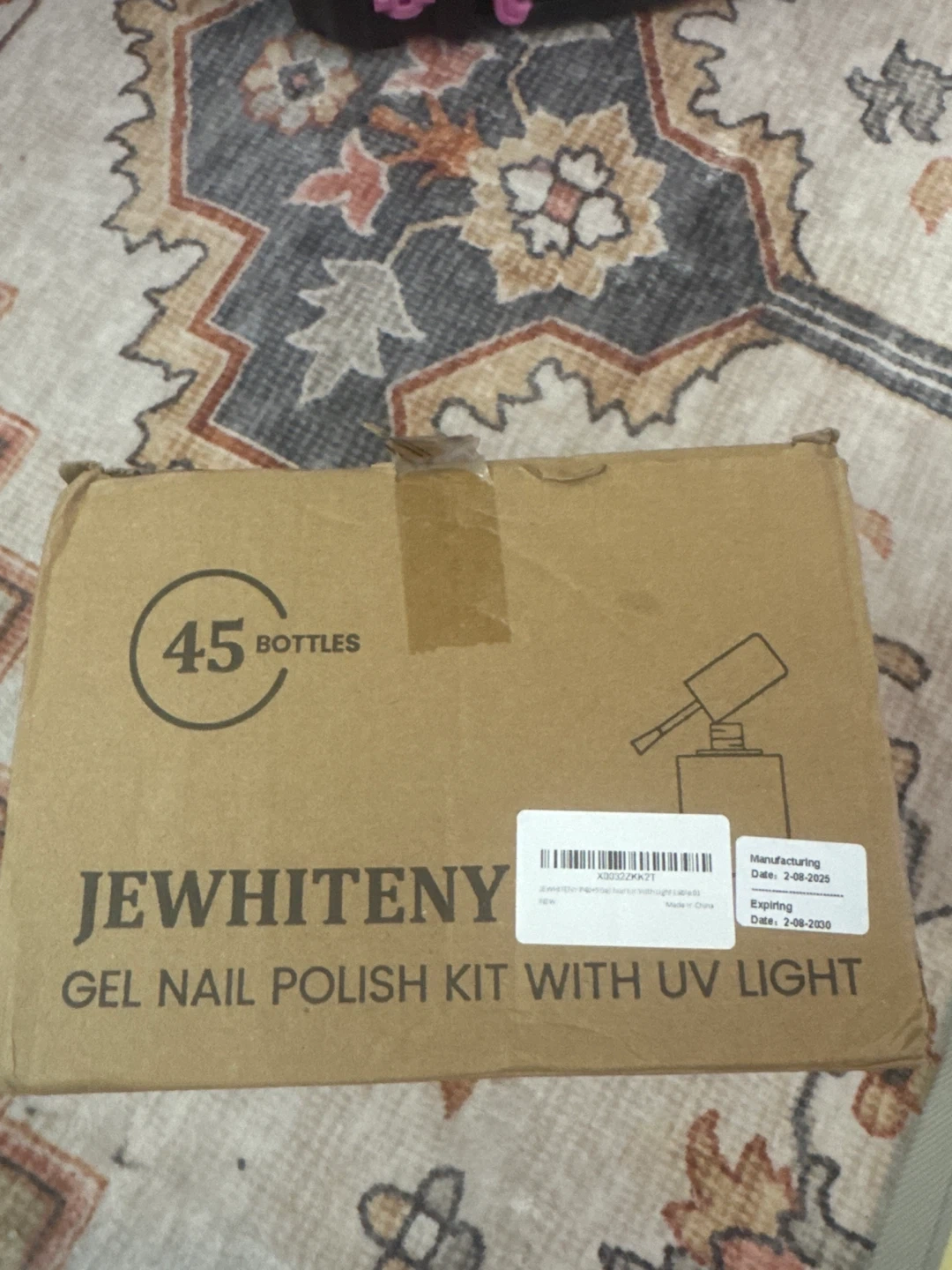 This JEWHITENY gel nail polish kit includes 45 bottles of polish and a professional LED nail dryer lamp. The kit contains a variety of colors, a base coat, and a top coat. Manufacturing Date: 2020 August 02. Expiry Date: 2020 August 02.