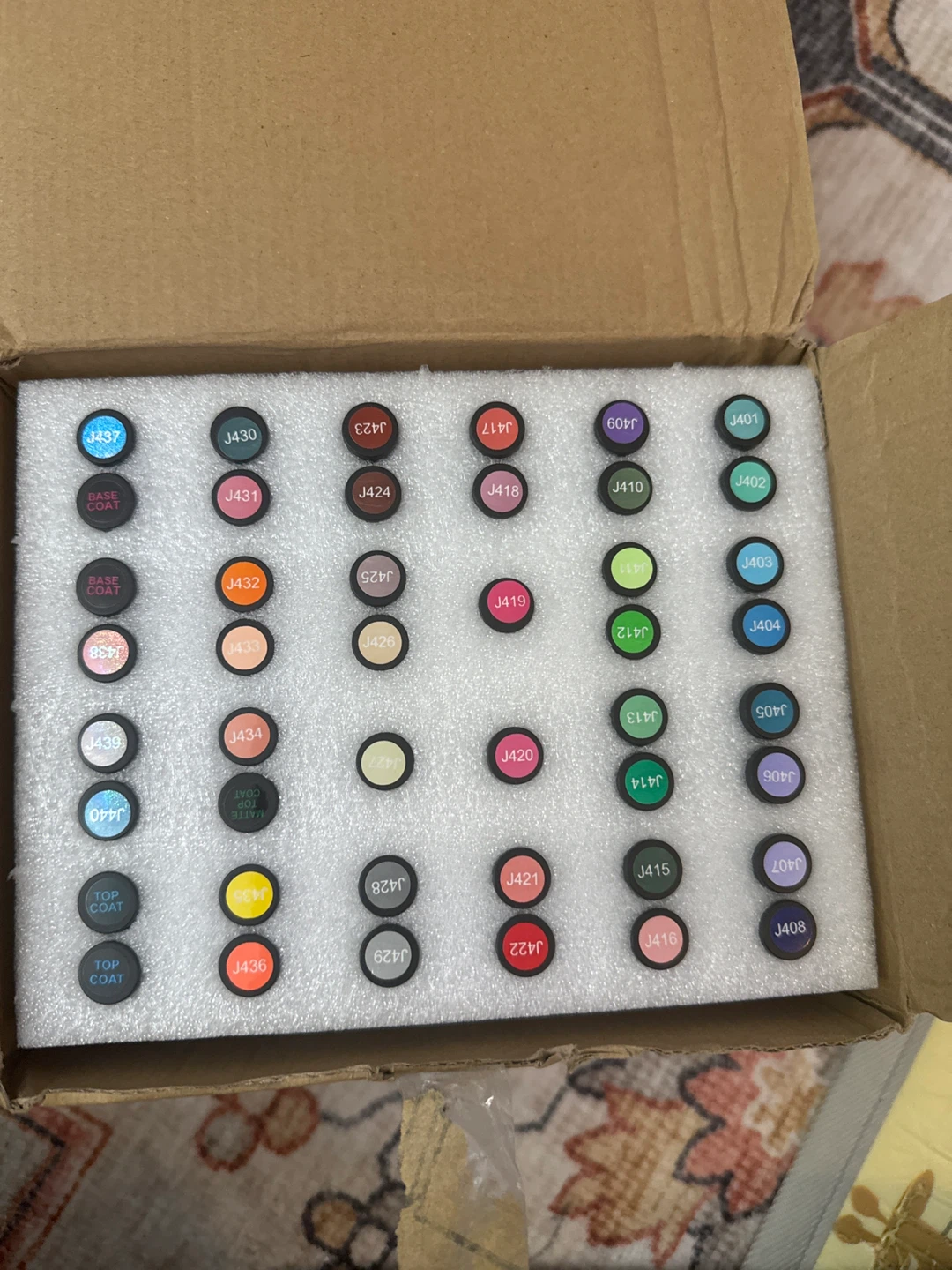 This JEWHITENY gel nail polish kit includes 45 bottles of polish and a professional LED nail dryer lamp. The kit contains a variety of colors, a base coat, and a top coat. Manufacturing Date: 2020 August 02. Expiry Date: 2020 August 02.