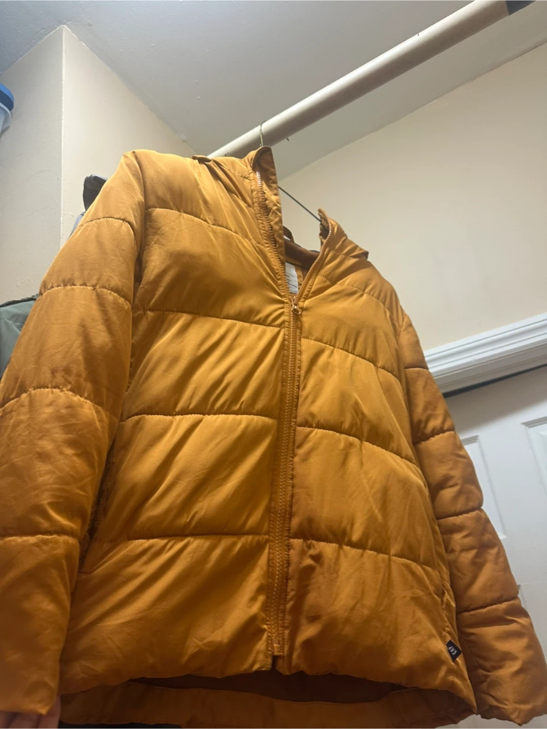 Mustard-colored Gap puffer jacket in great condition! It's super warm and perfect for chilly weather. The jacket is lightweight and portable, making it easy to carry around. It's a stylish and practical addition to any wardrobe