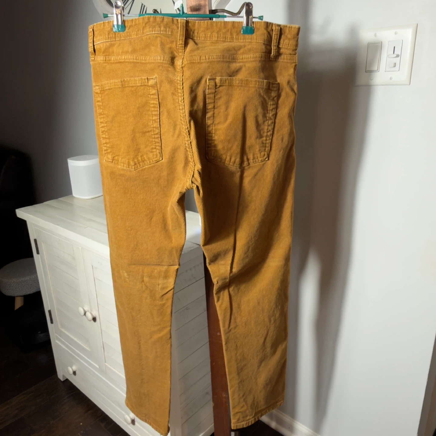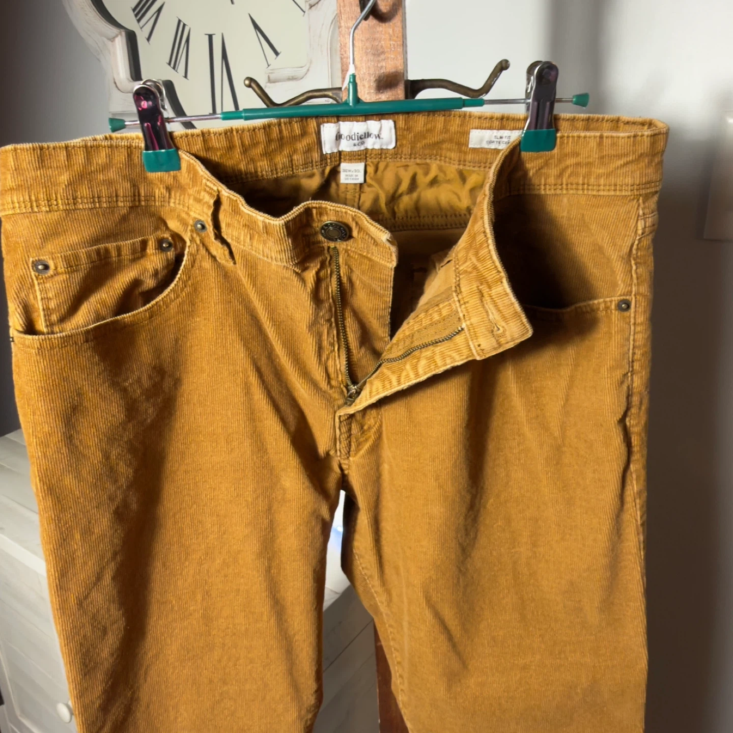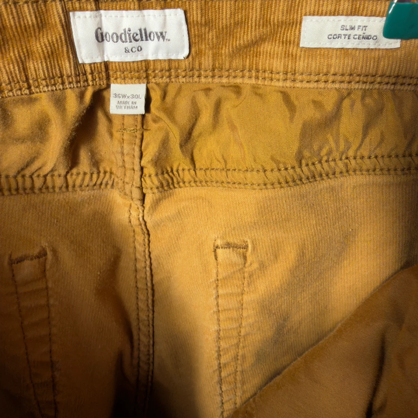 These are Goodfellow & Co corduroy pants in a slim fit. They're a rich golden brown color and made from durable corduroy material. Measurements are 36-inch waist and 30-inch inseam. Perfect for casual wear!
