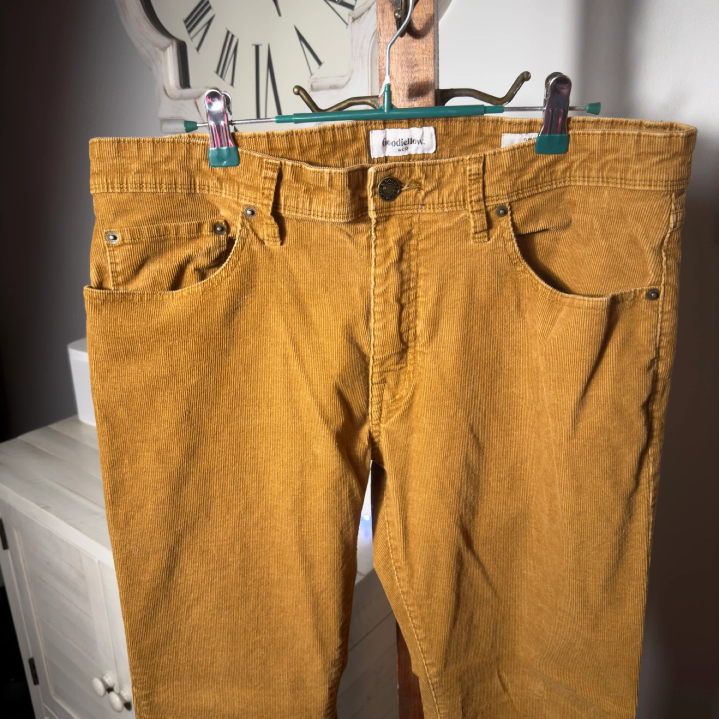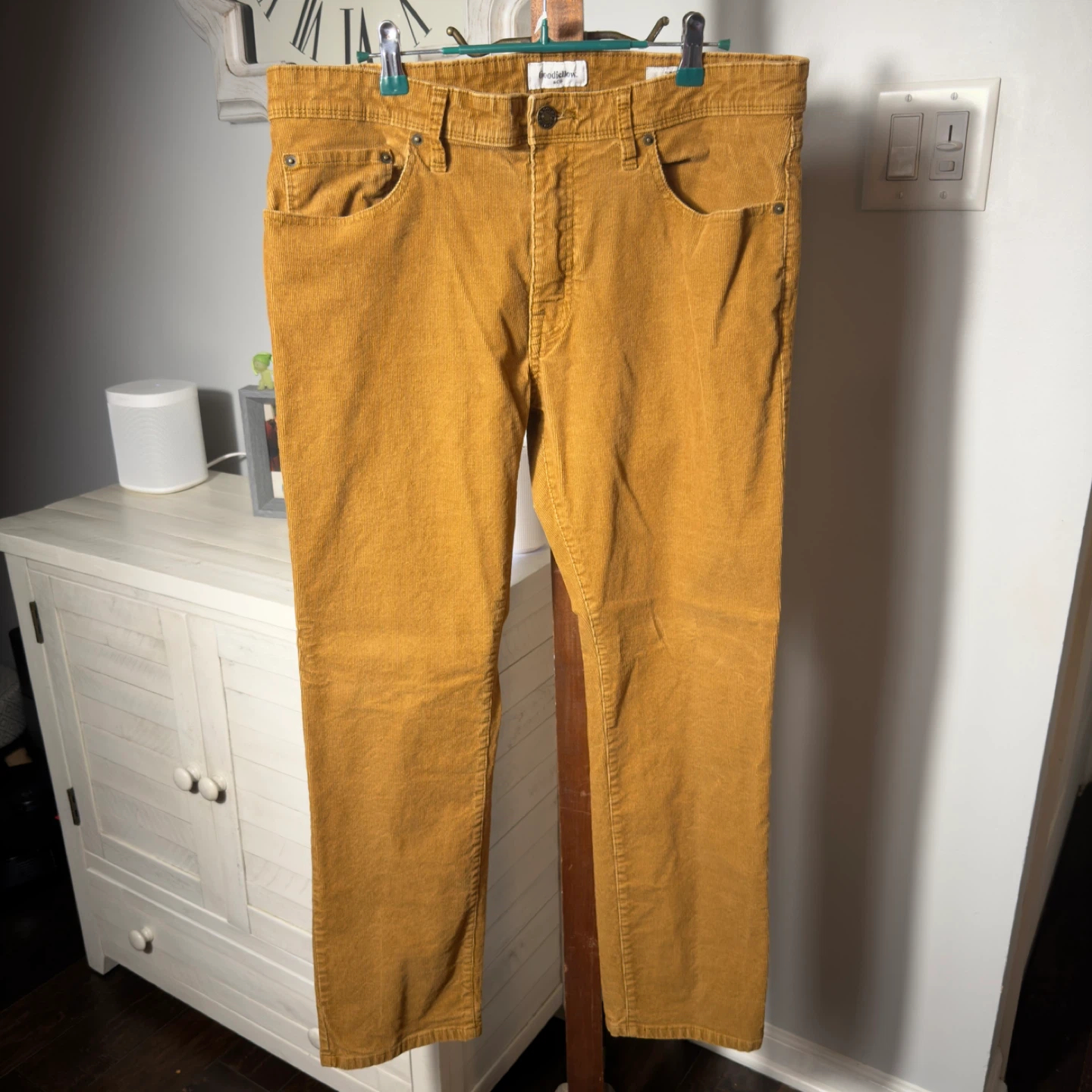 These are Goodfellow & Co corduroy pants in a slim fit. They're a rich golden brown color and made from durable corduroy material. Measurements are 36-inch waist and 30-inch inseam. Perfect for casual wear!