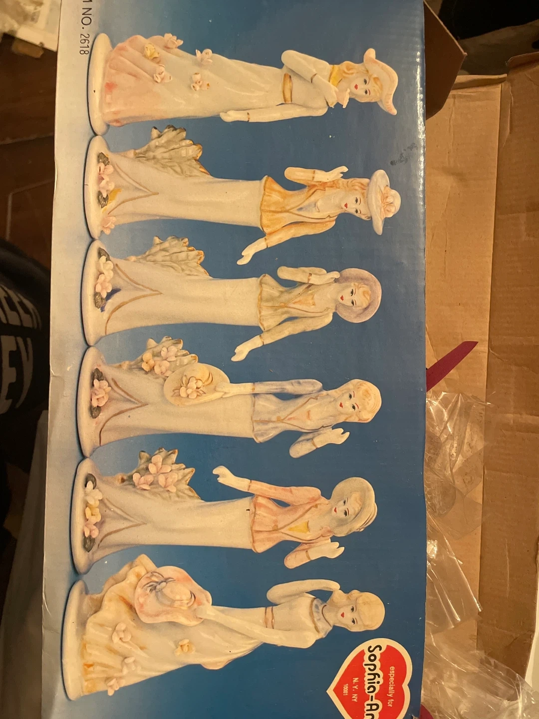 A single set features six elegant porcelain figurines dressed in vintage attire. Each figurine showcases intricate detailing and delicate hand-painted accents. They're perfect for display on shelves or as decorative accents in any room.