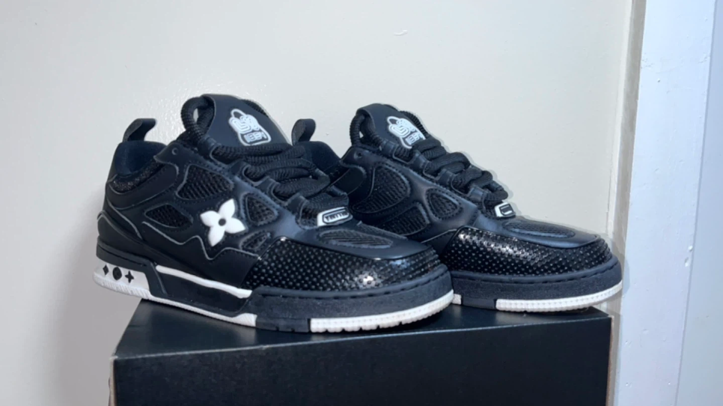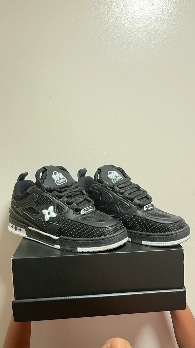 Selling a pair of Louis Vuitton skate sneakers in black. They are in good condition and come with the box. The size is US 8.