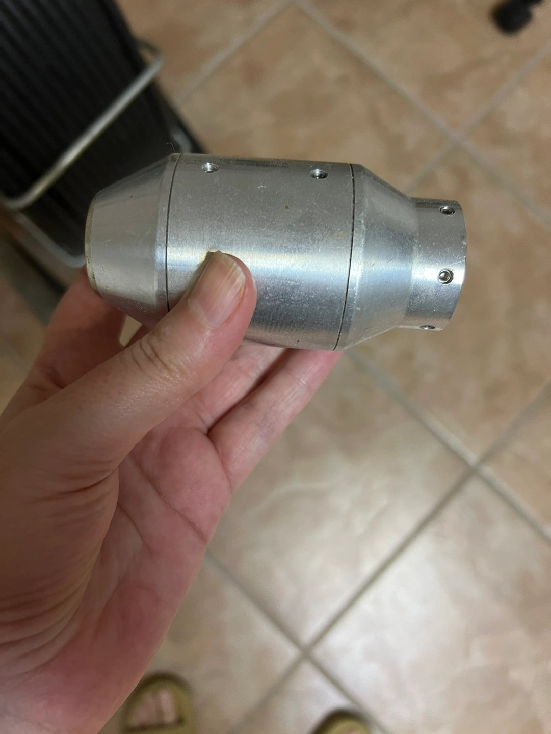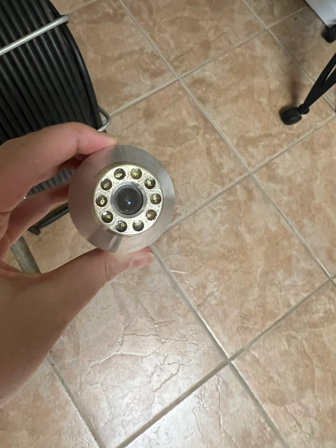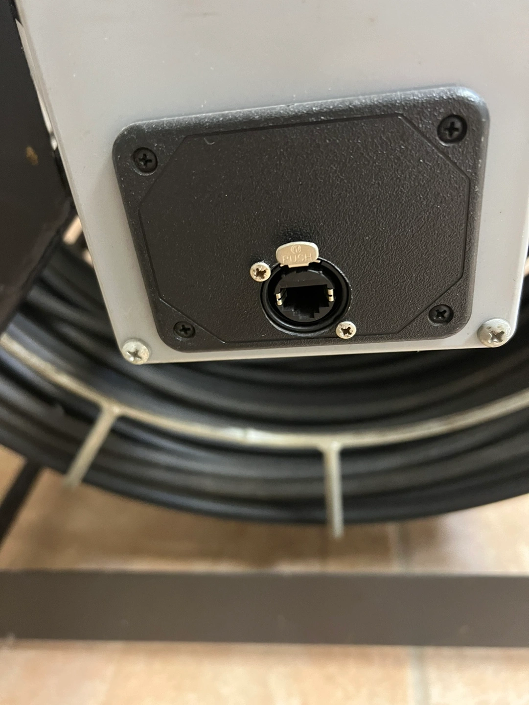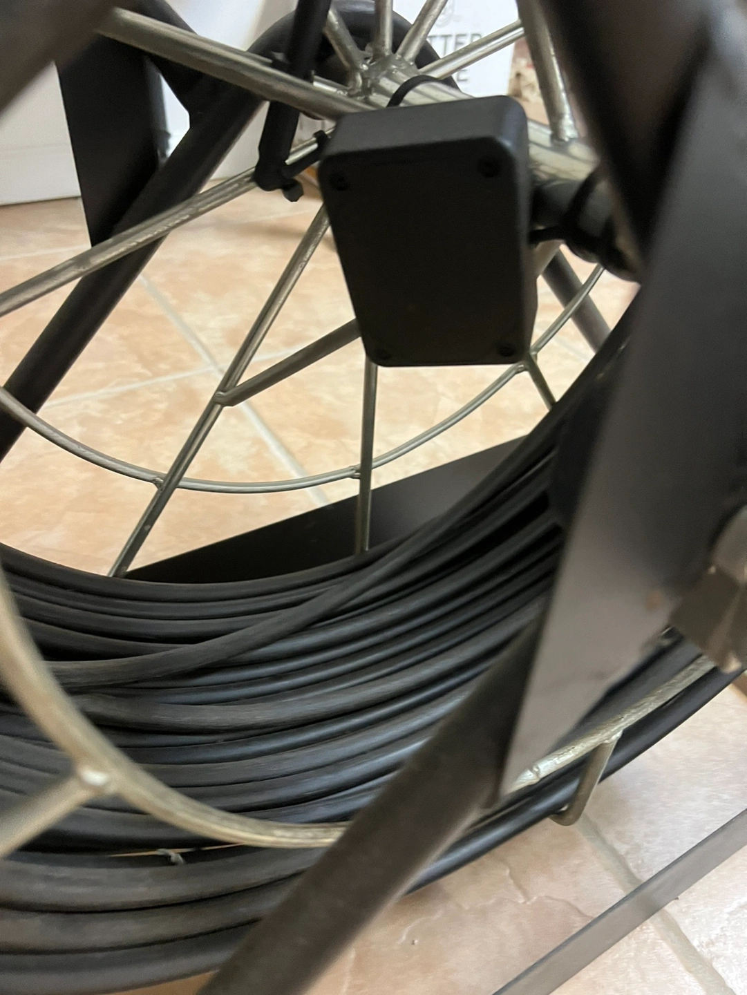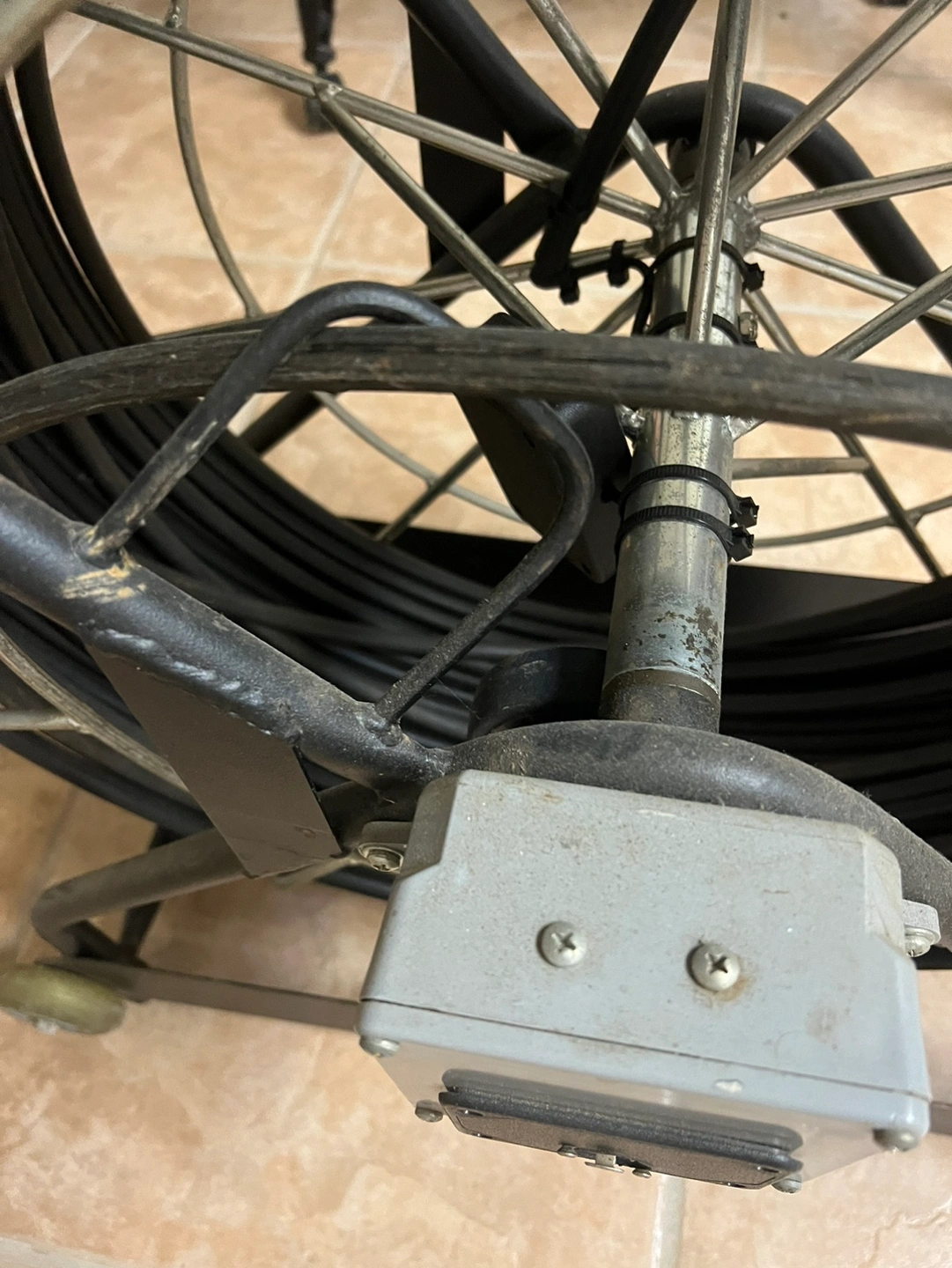 Includes a reel, cable, and a tip. The cable is about 150 ft. long. The reel has wheels. There is a hand crank on the side of the reel. The tip has a small metal handle. Sewer camera used a few time but needed a longer distance