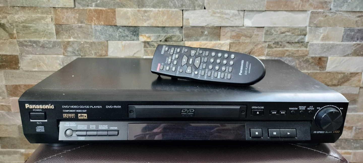 Panasonic DVD-RV31 DVD Video CD player. Plays DVDs and CDs. Includes remote. Component video output. Dolby Digital and DTS Digital Out. One-touch cinema memory. Advanced surround. Bass plus. Dialogue enhancer. Hi-speed scan x100.