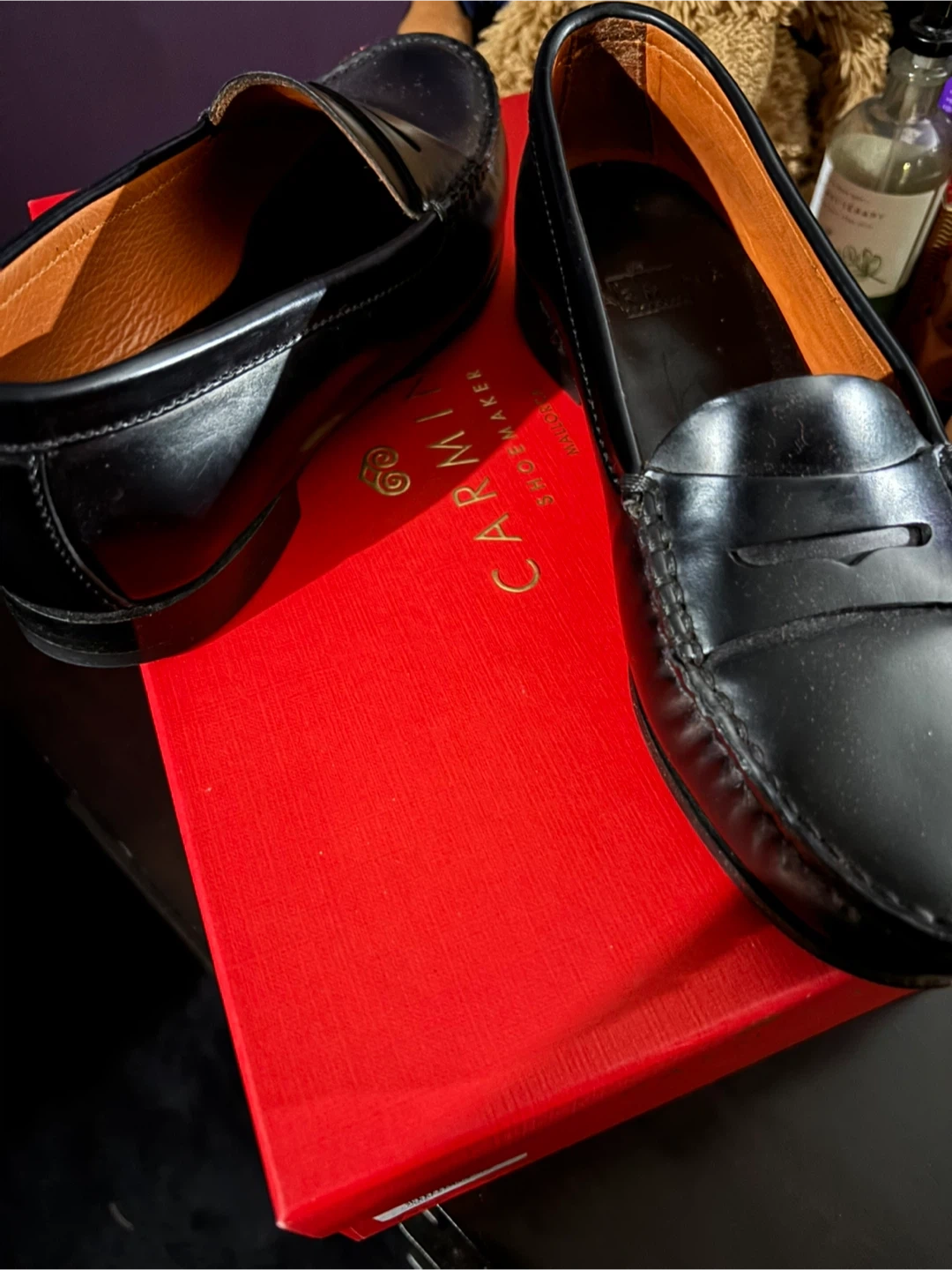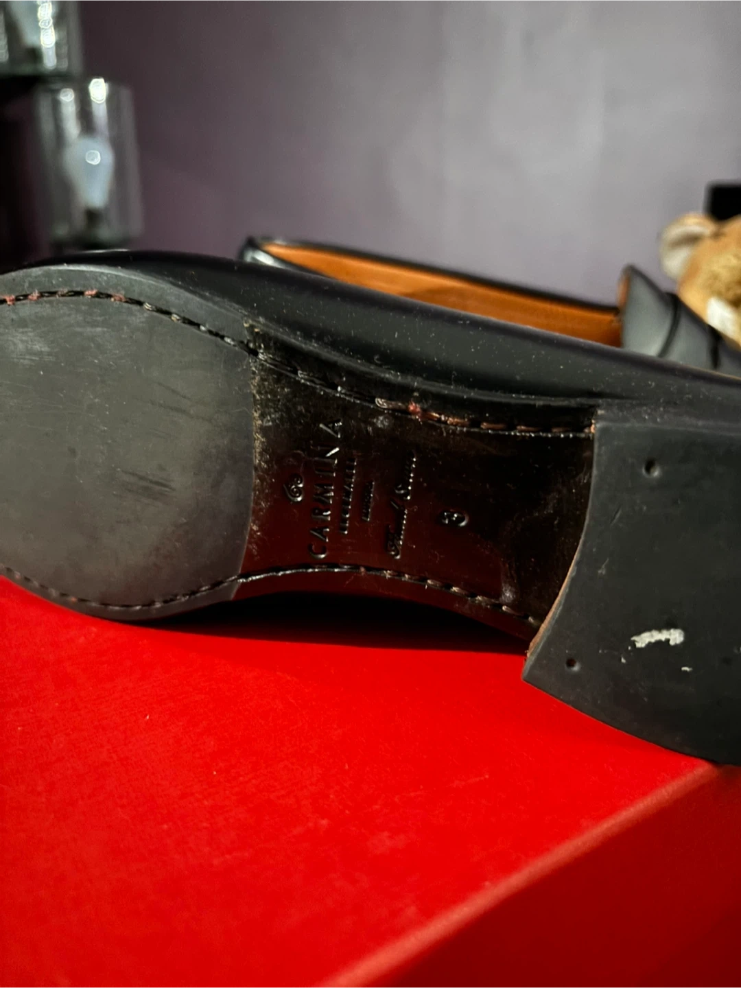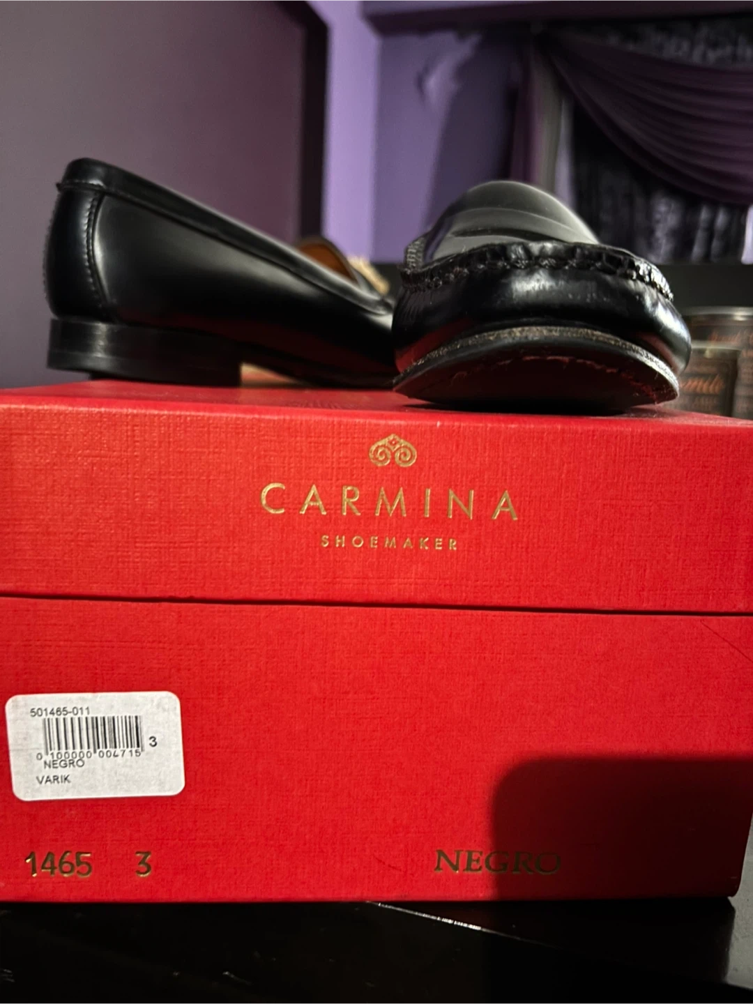 These are black leather loafers from Carmina Shoemaker. They are a size European 3. The shoes are made of leather.