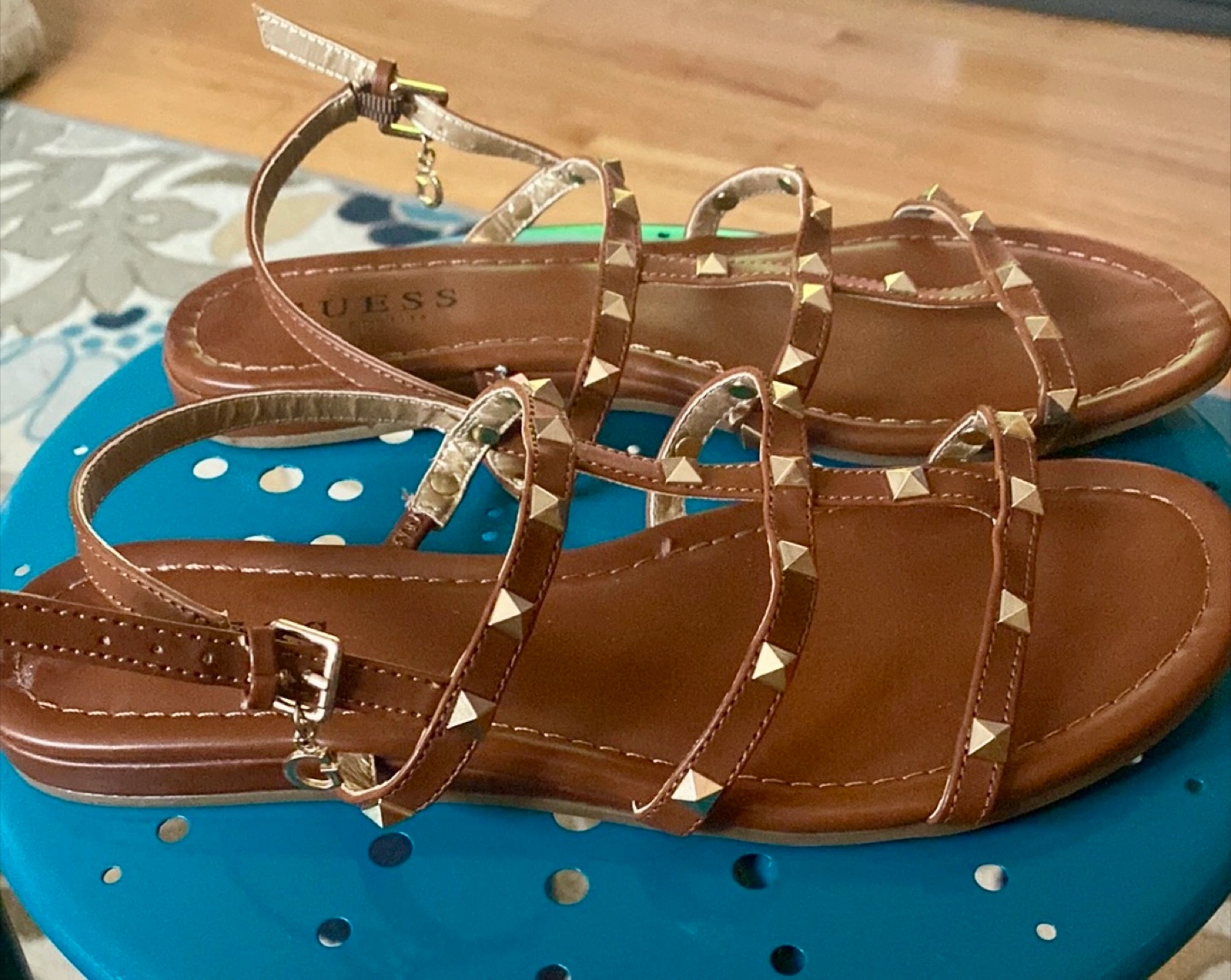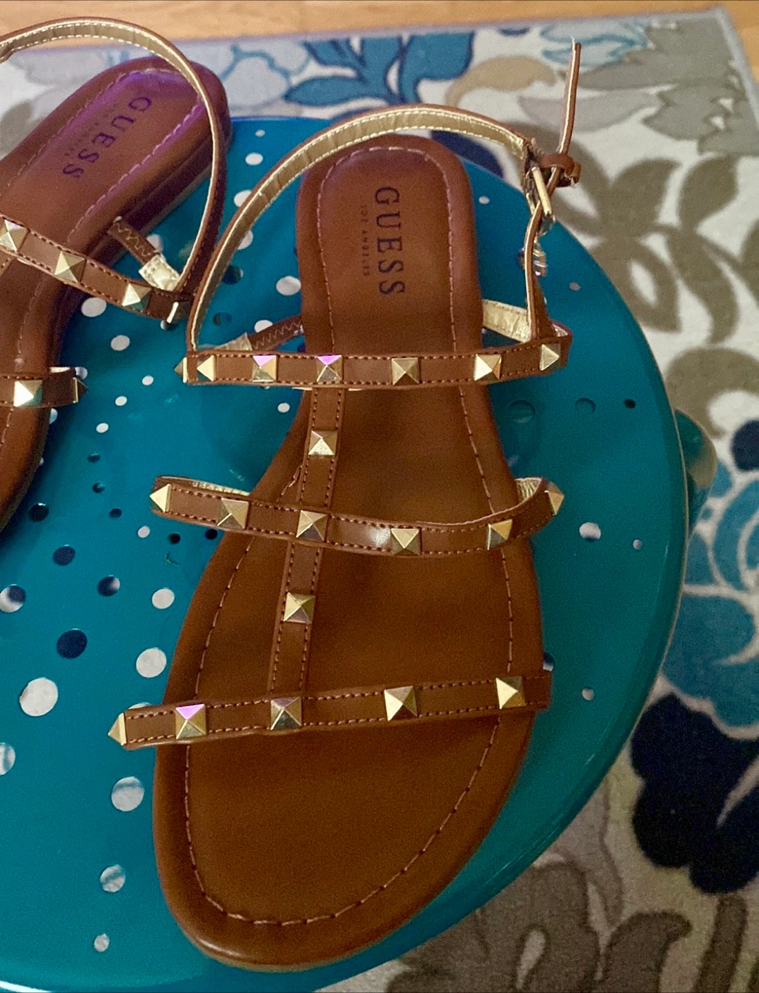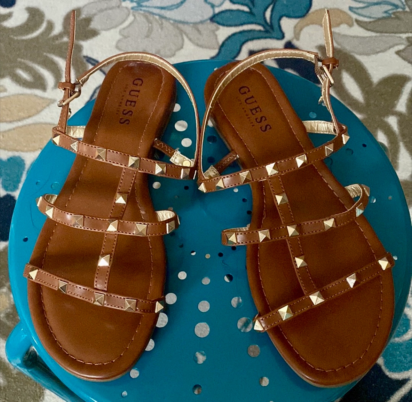 Used Brown Guess sandals. Gold studs. Ankle strap. Open toe. CHECK OUT MY OTHER OFFERS