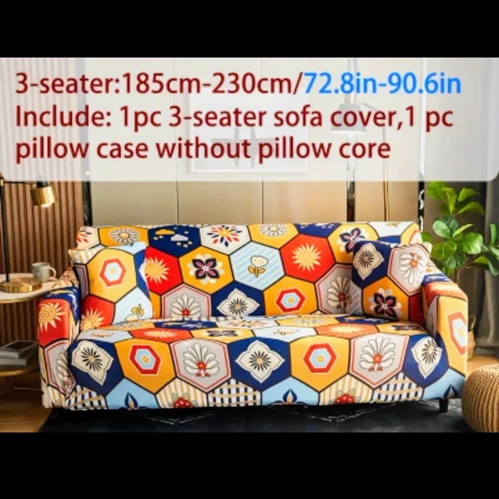 Sofa cover with a colorful geometrical pattern. Includes a 3-seater sofa cover and pillow case. Use it to protect your sofa while also adding a touch of style to your living space.