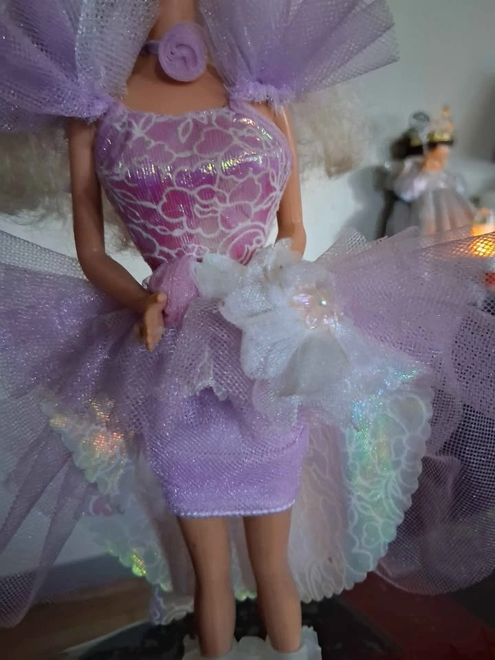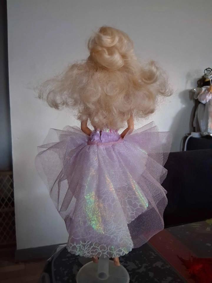 Features: Includes an iridescent lavender short dress and a matching tulle overskirt that can be used as a cape, long skirt, or even as a hat.