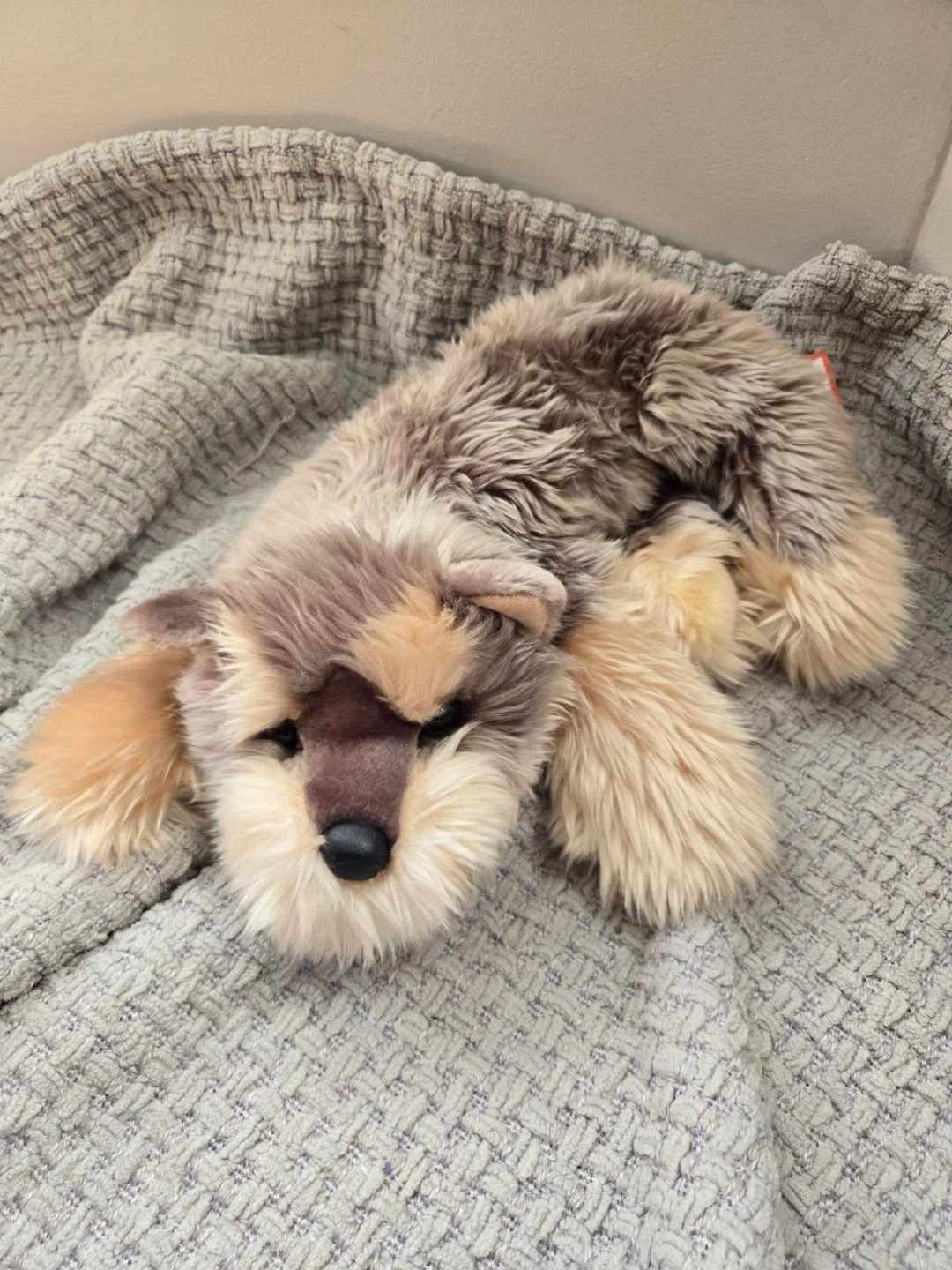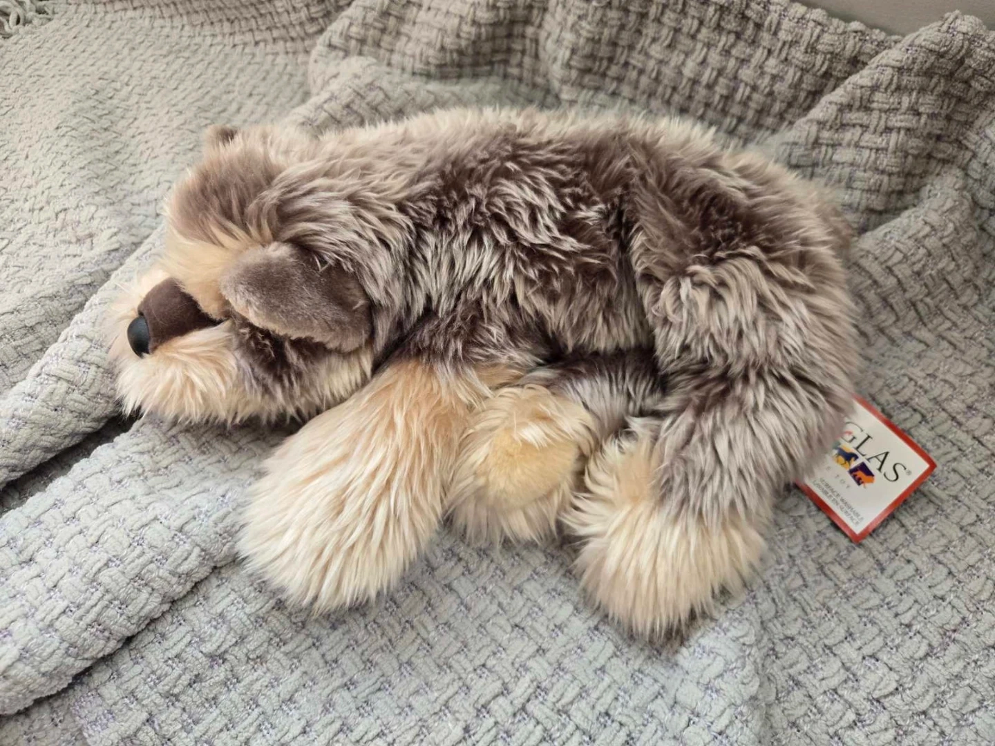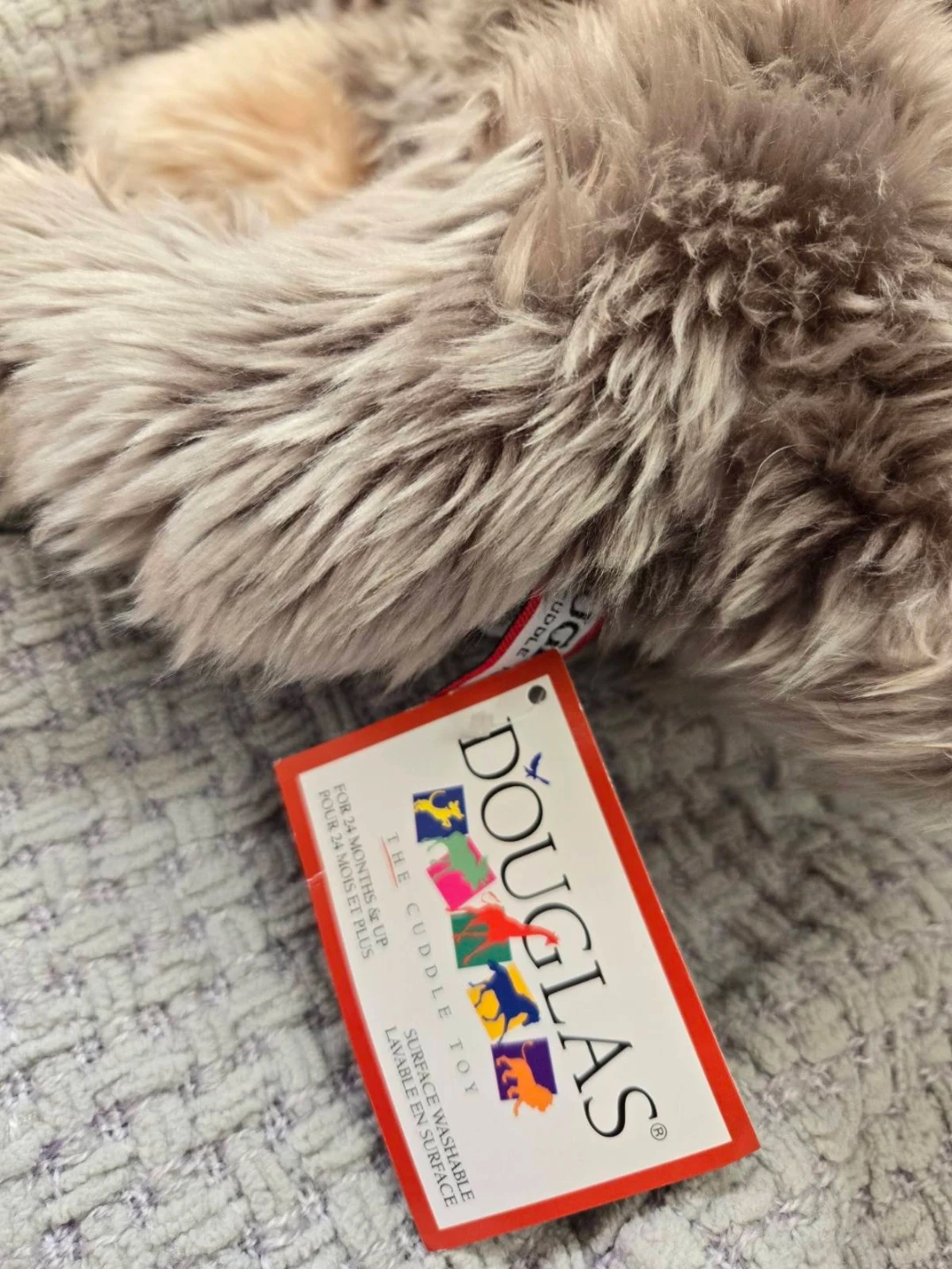This is a Douglas brand plush dog toy. It's surface washable and recommended for ages 24 months and up. A super soft and cuddly companion!