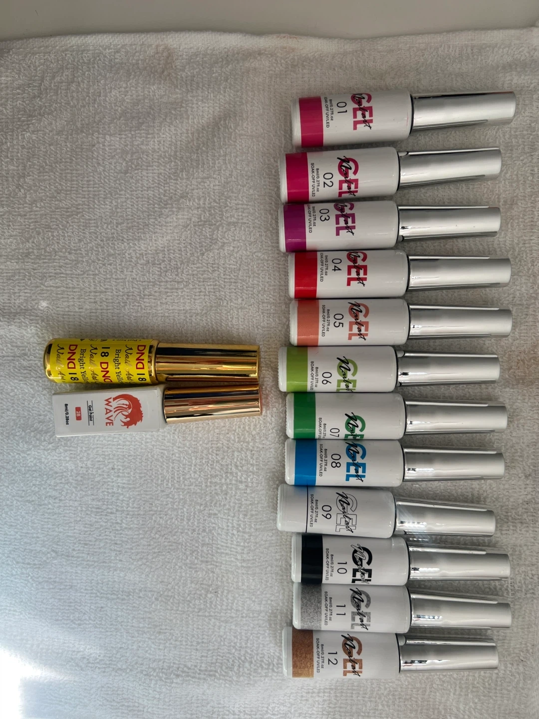 I'm selling a collection of 14 nail gel polishes! You'll get a variety of colors from brands like DNG and others. Each bottle contains 8ml/0.27fl.oz of soak-off UV/LED gel
