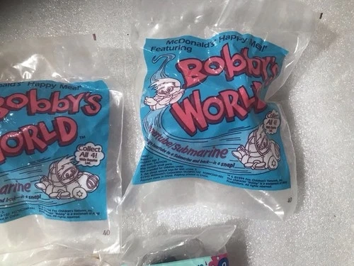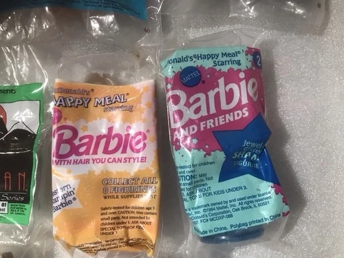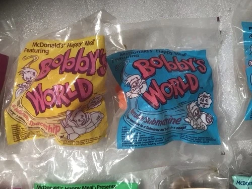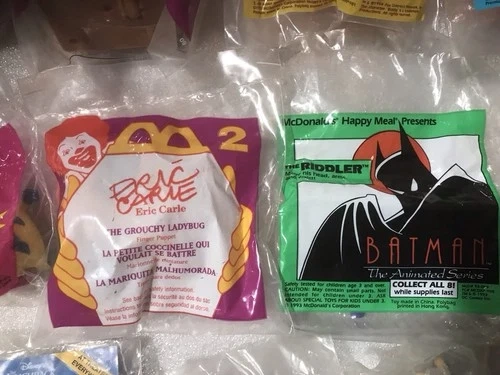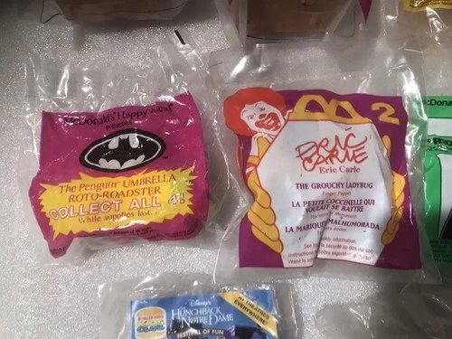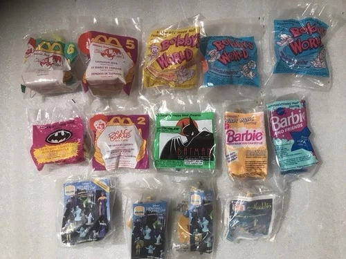 65The product is a collection of 14 unopened McDonald's Happy Meal toys and Burger King toys. These toys are likely promotional items released by the fast-food chains, featuring various characters or themes related to their menu items. This set is perfect for collectors or fans of fast-food memorabilia, offering a diverse selection of toys from different restaurants. Some wear/ discoloration to packaging.