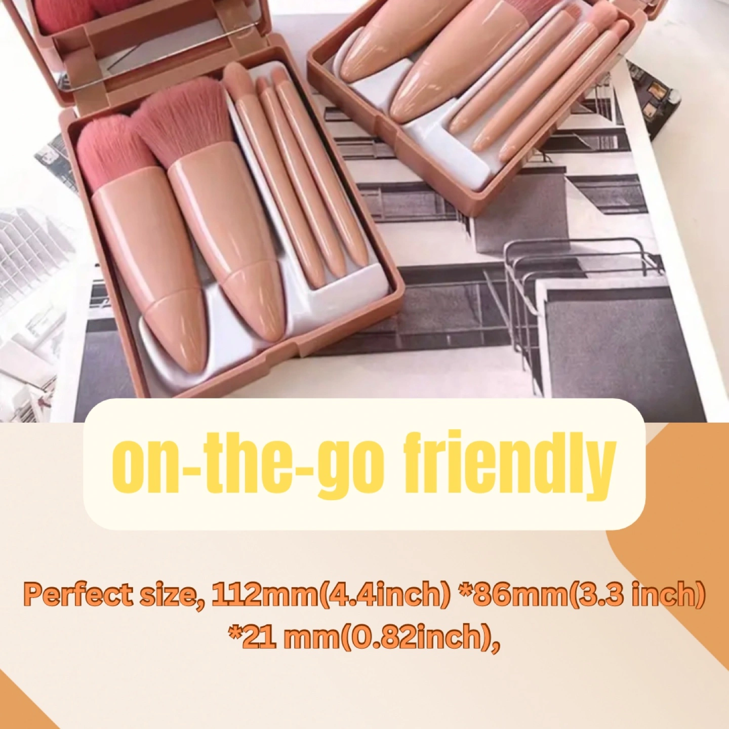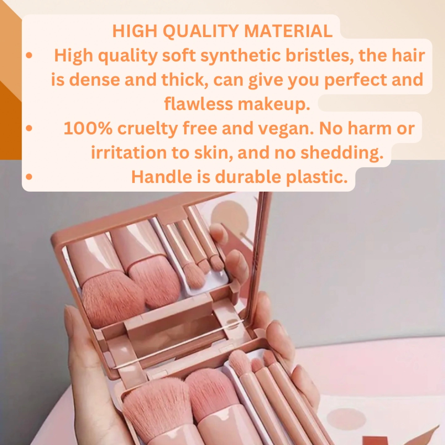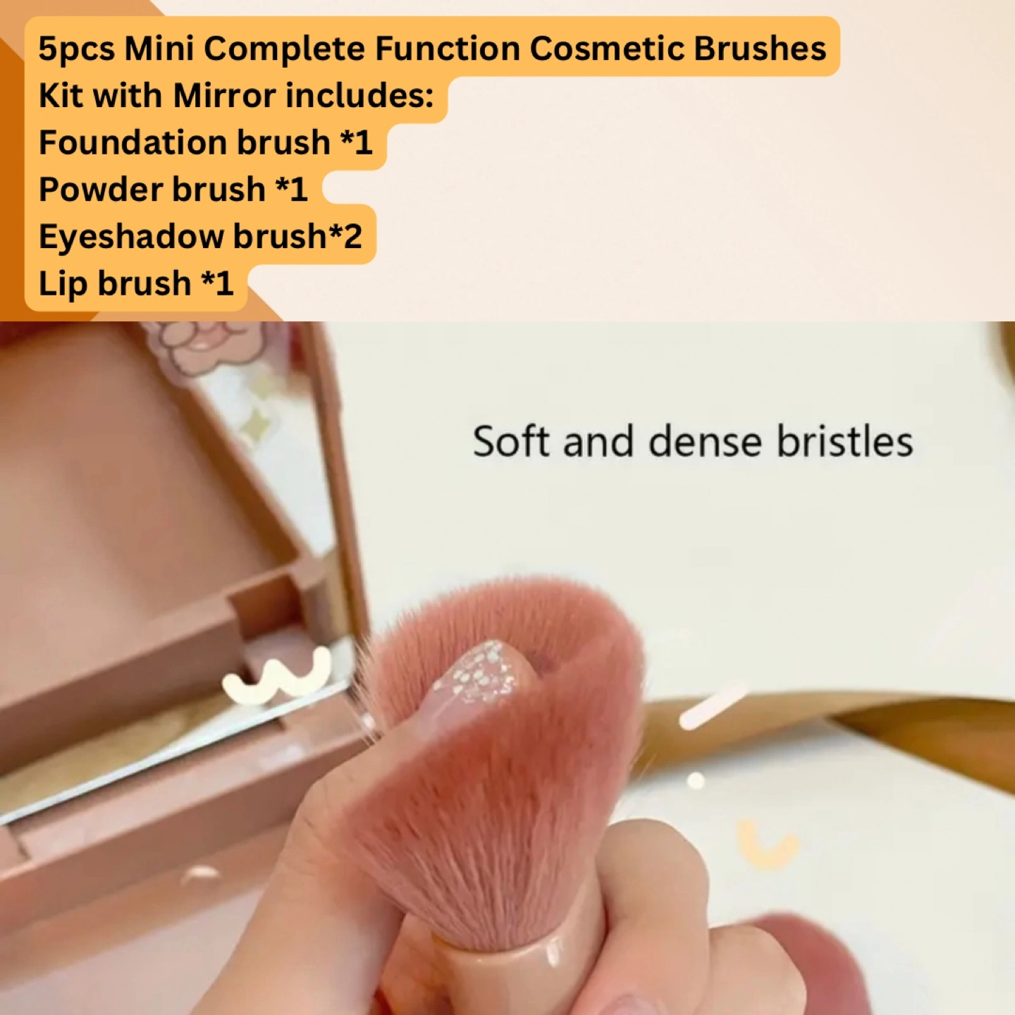 Includes foundation, powder, eyeshadow, and lip brushes. Soft, synthetic bristles. Comes in a small, travel-friendly case.