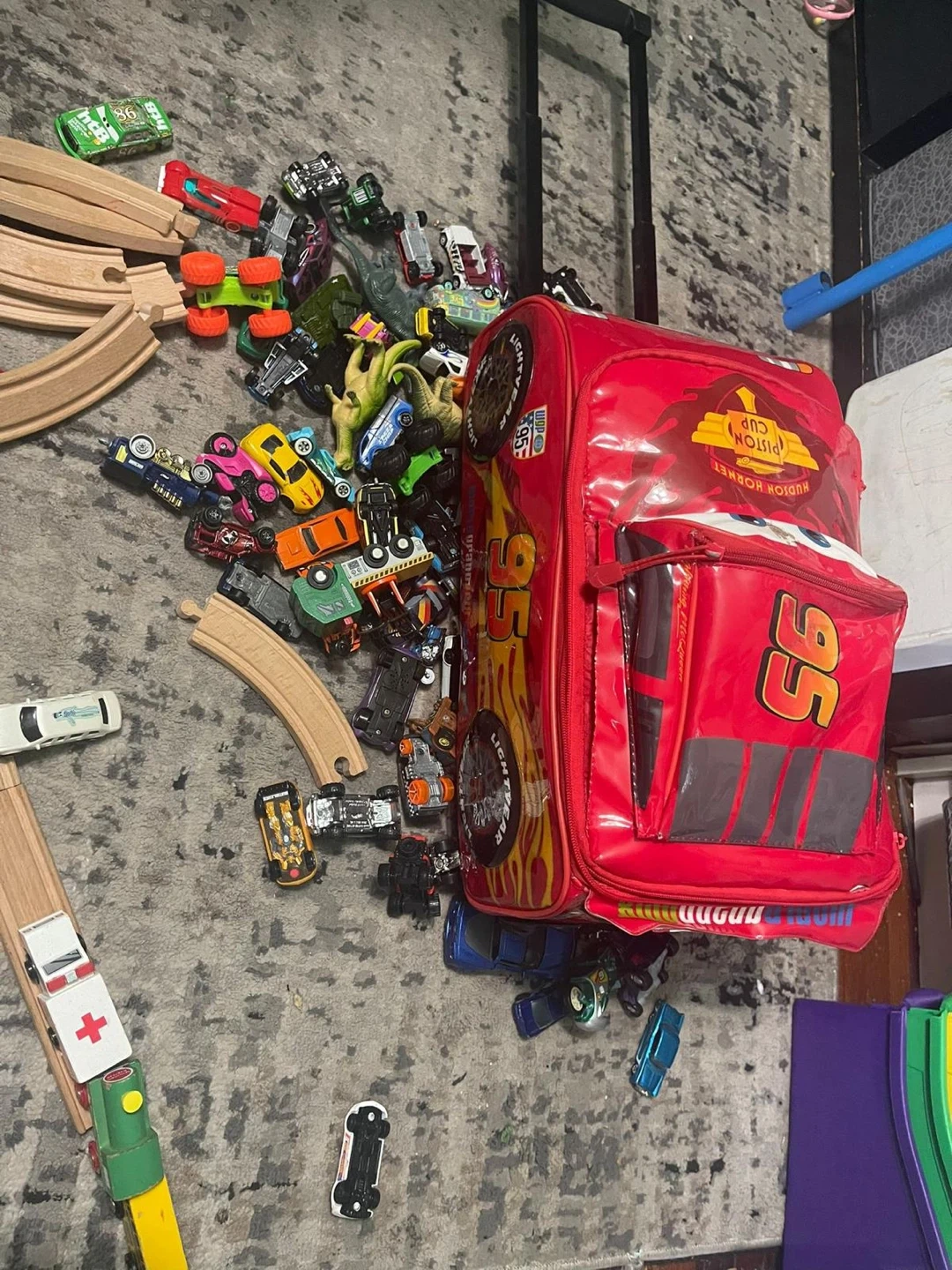 145 cars in the shop each a year a value between 3-4 dollars + the troller inside which are dinosaurs and a wooden track with the train the price is a good price and I do not accept offers