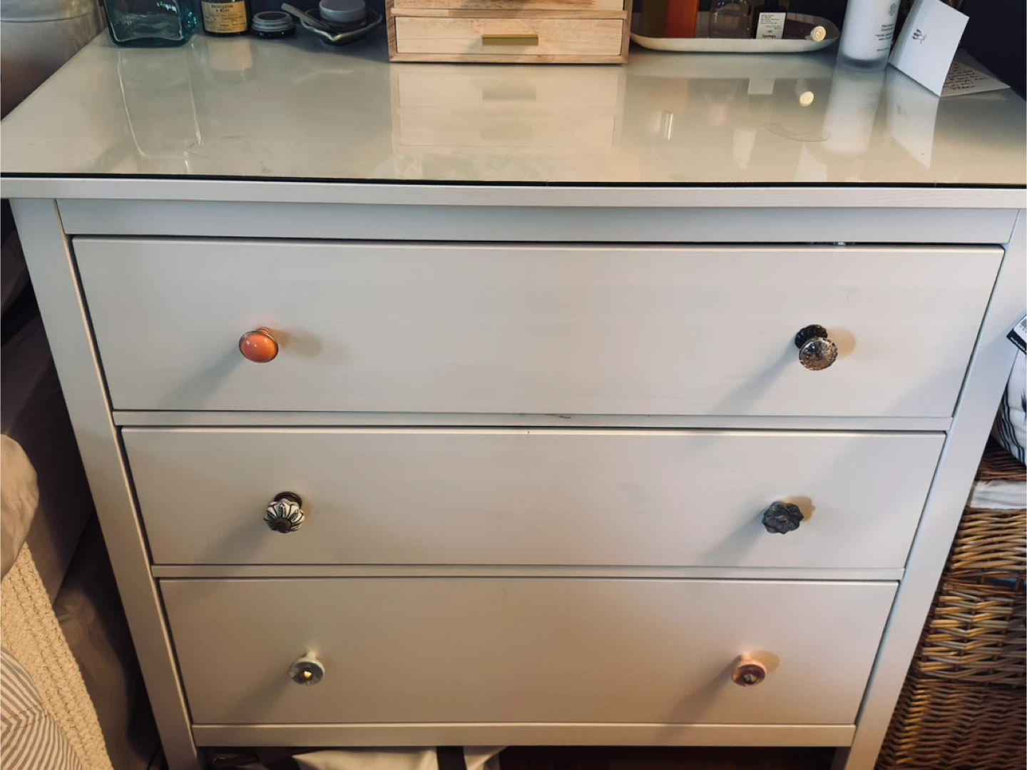 Selling a white IKEA Hemnes 3-drawer dresser. The dresser has a glass top. Some tiny scratches