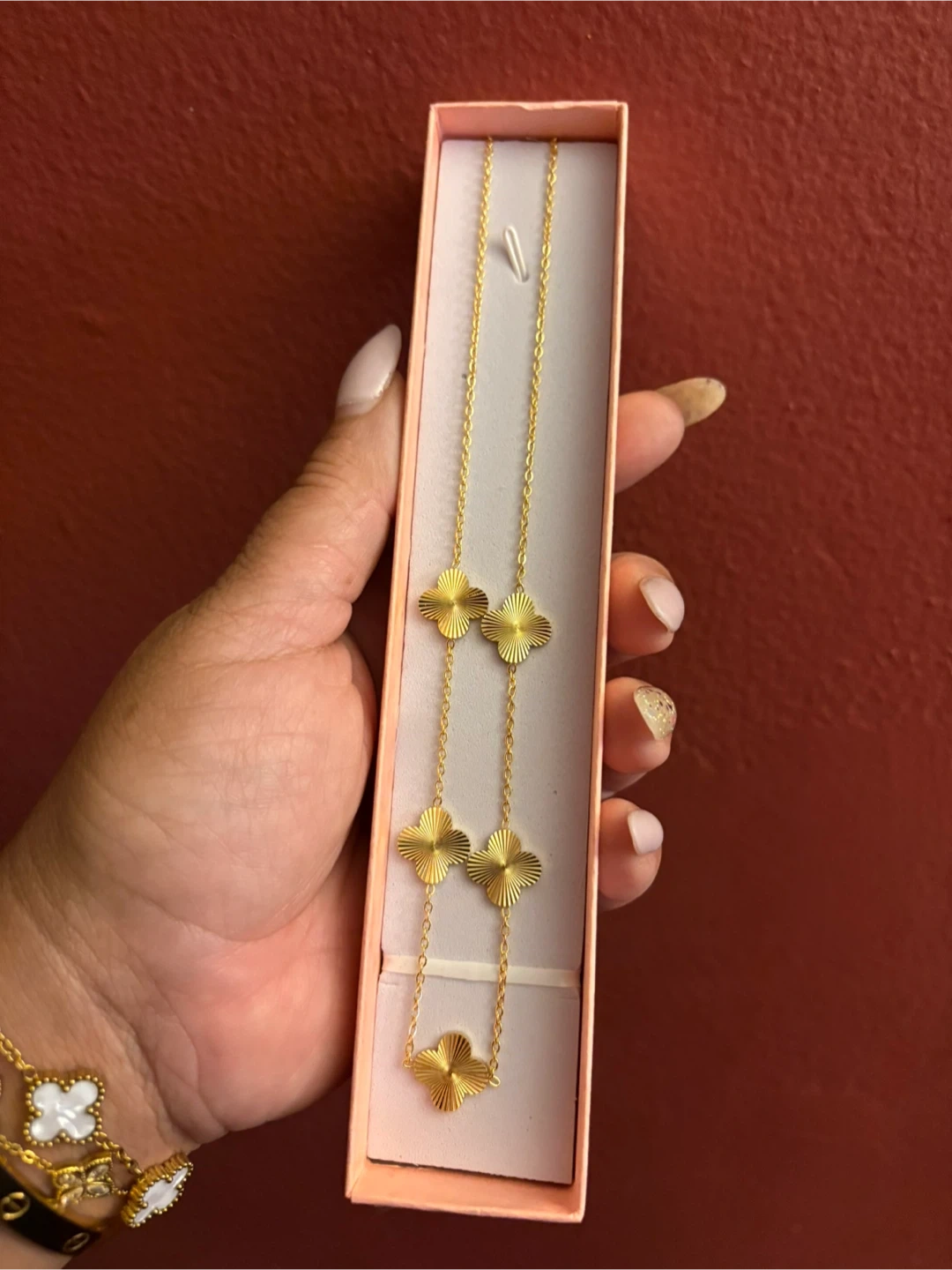 Selling a beautiful 14K gold Stainless Steel clover necklace! It's brand new and comes in its original box. The necklace features a delicate chain with clover-shaped pendants, perfect for adding a touch of elegance to any outfit