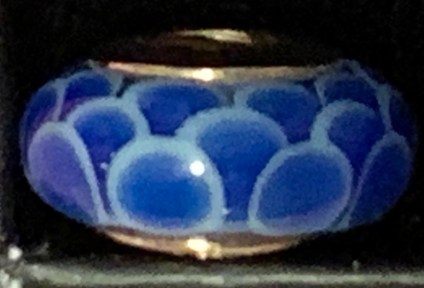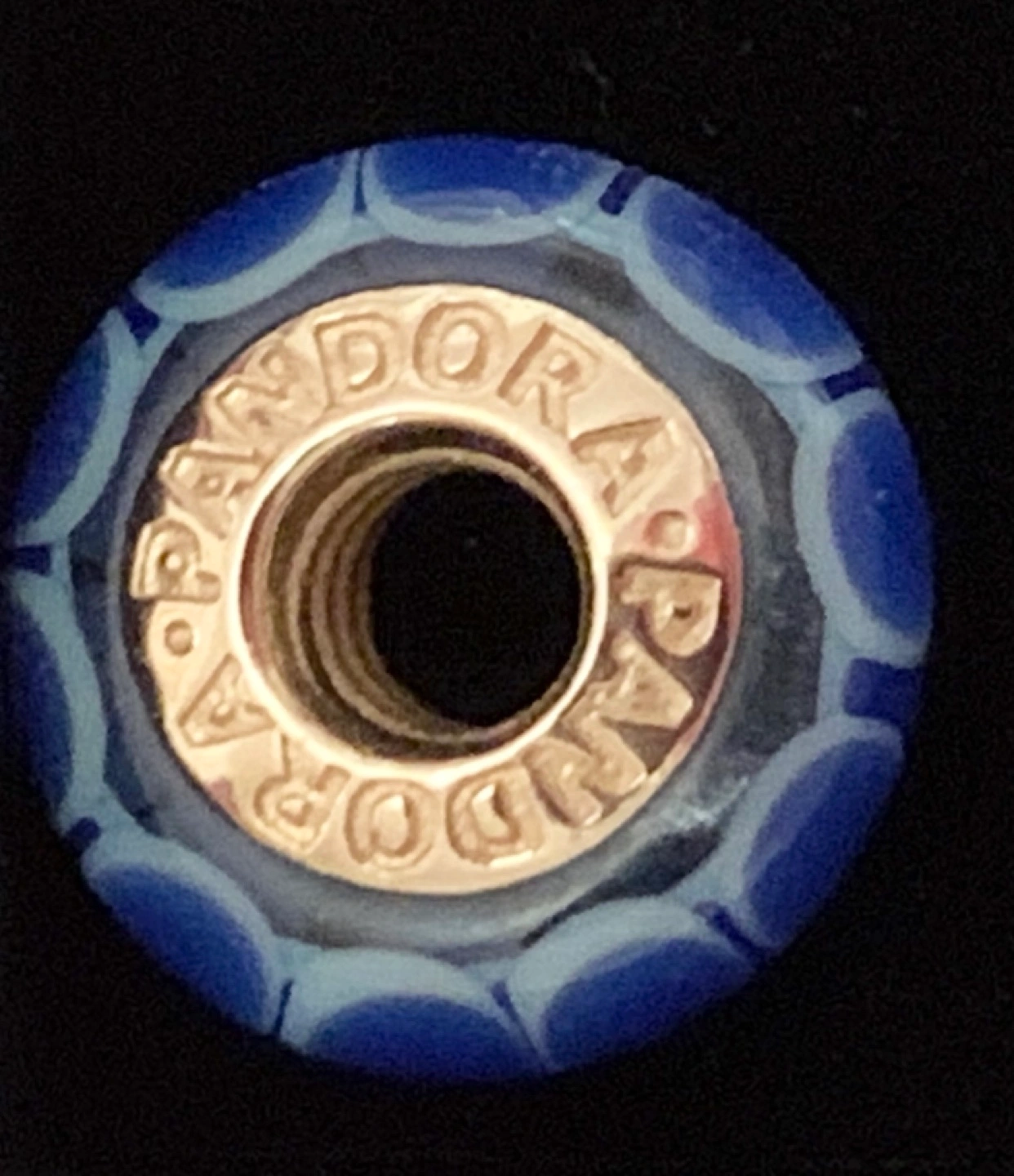 14K Genuine Pandora charm bead. Blue murano glass with white pattern. Fits Pandora bracelets. Pre-owned. Mint condition. [I have two for sale — $125 for one. $200 for both]