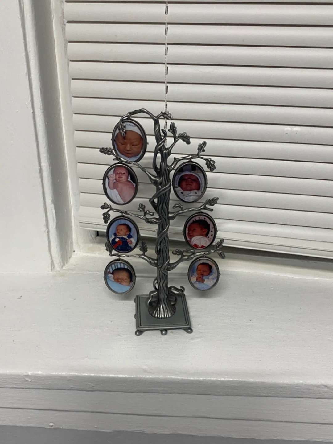 This photo tree features a decorative metal design perfect for displaying multiple small photos. It has a base for stability and branches to hold oval-shaped frames. Great for showcasing family memories!