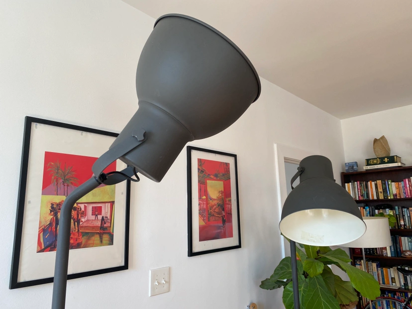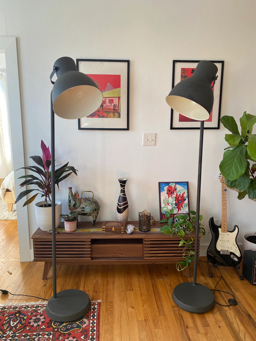 Two gray statement floor lamps in like-new condition, fully adjustable with a floor step-switch. Bulbs included 💡