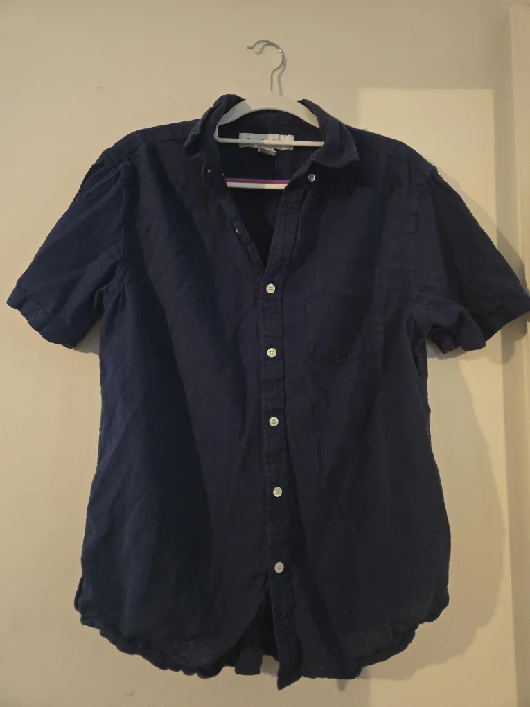 This is a navy blue, short-sleeve button-up shirt. It's made of a lightweight material. The shirt has a collared neckline and a chest pocket.