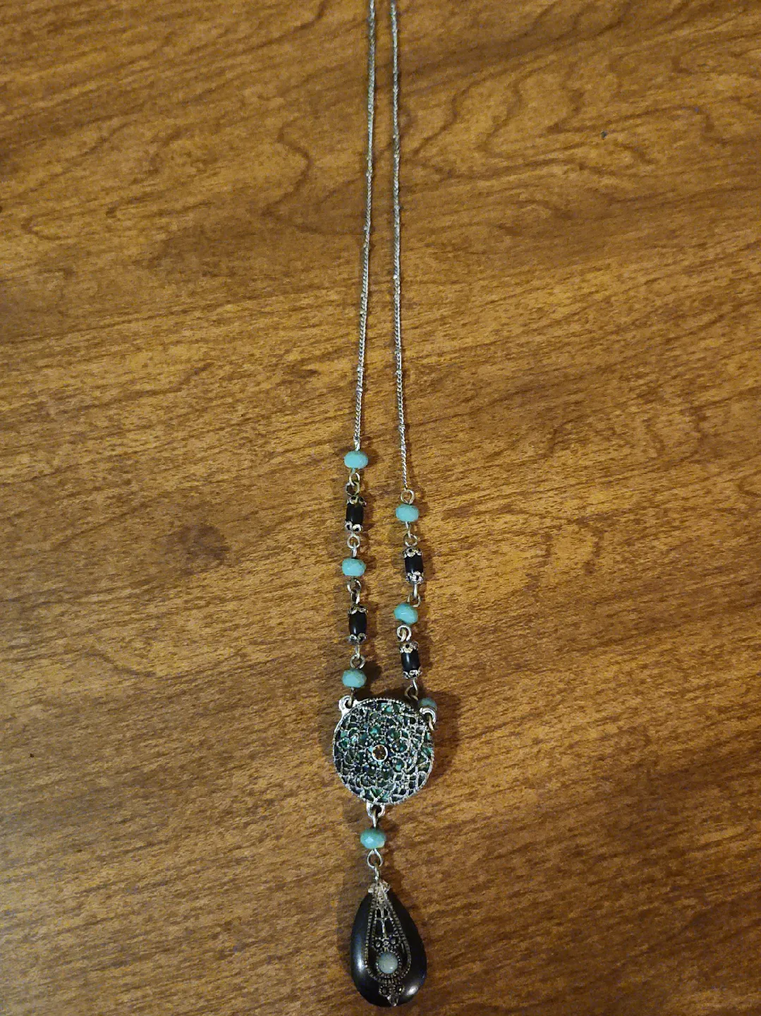 This is a pendant necklace with silver chain and a mix of turquoise and black beads. The pendant has a detailed design with a black teardrop at the bottom. It's in great condition and ready to add some style to your wardrobe
