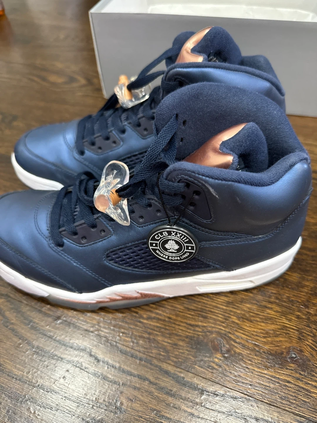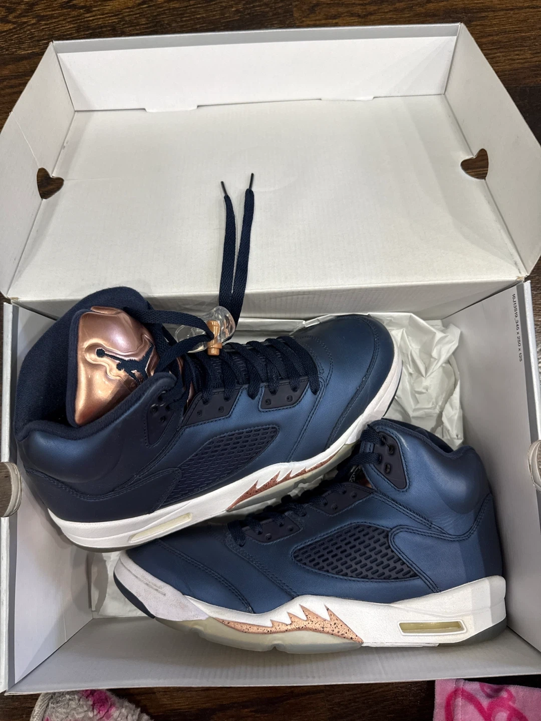 These Air Jordan 5 Retro sneakers feature a deep navy blue satin upper with striking rose gold accent. Replacement box