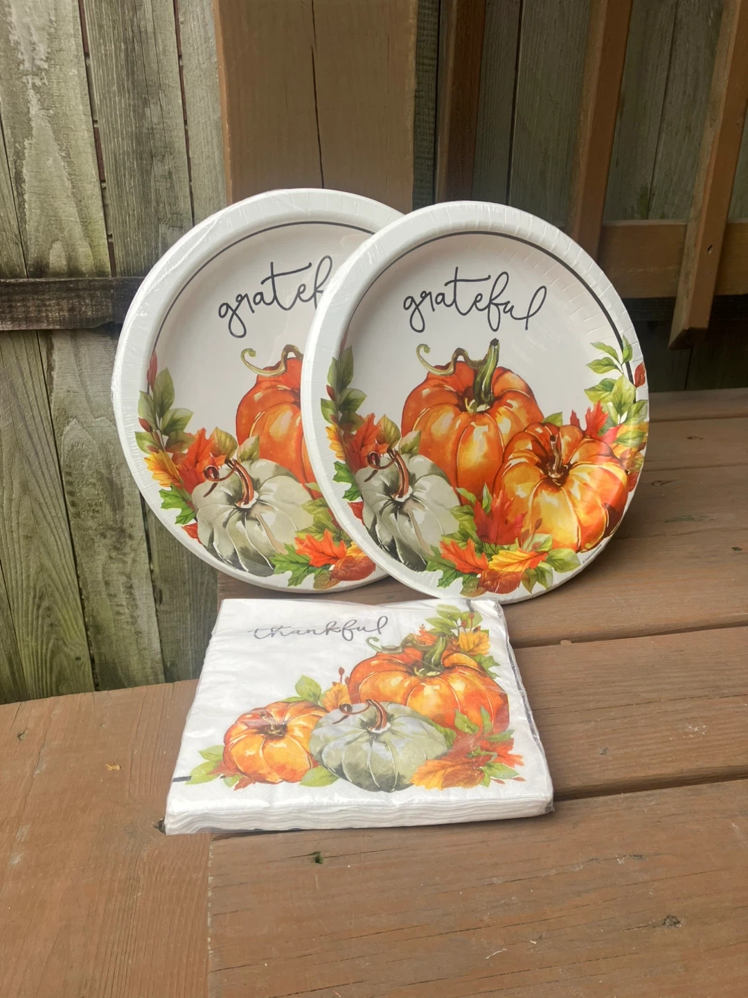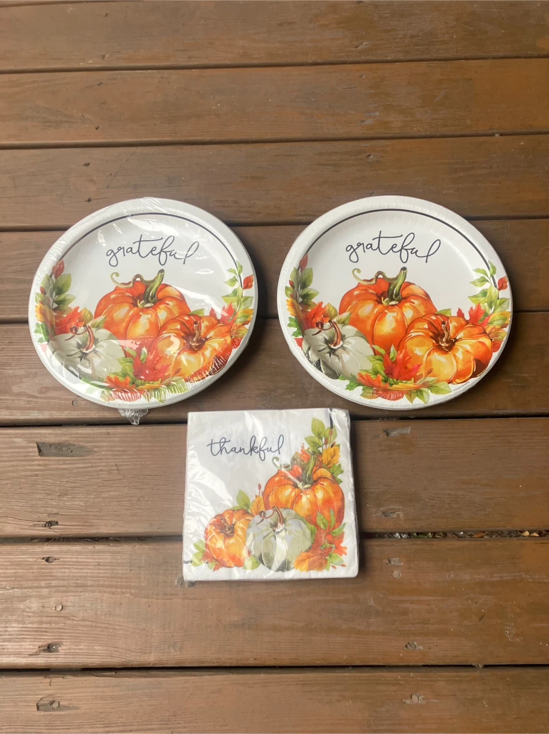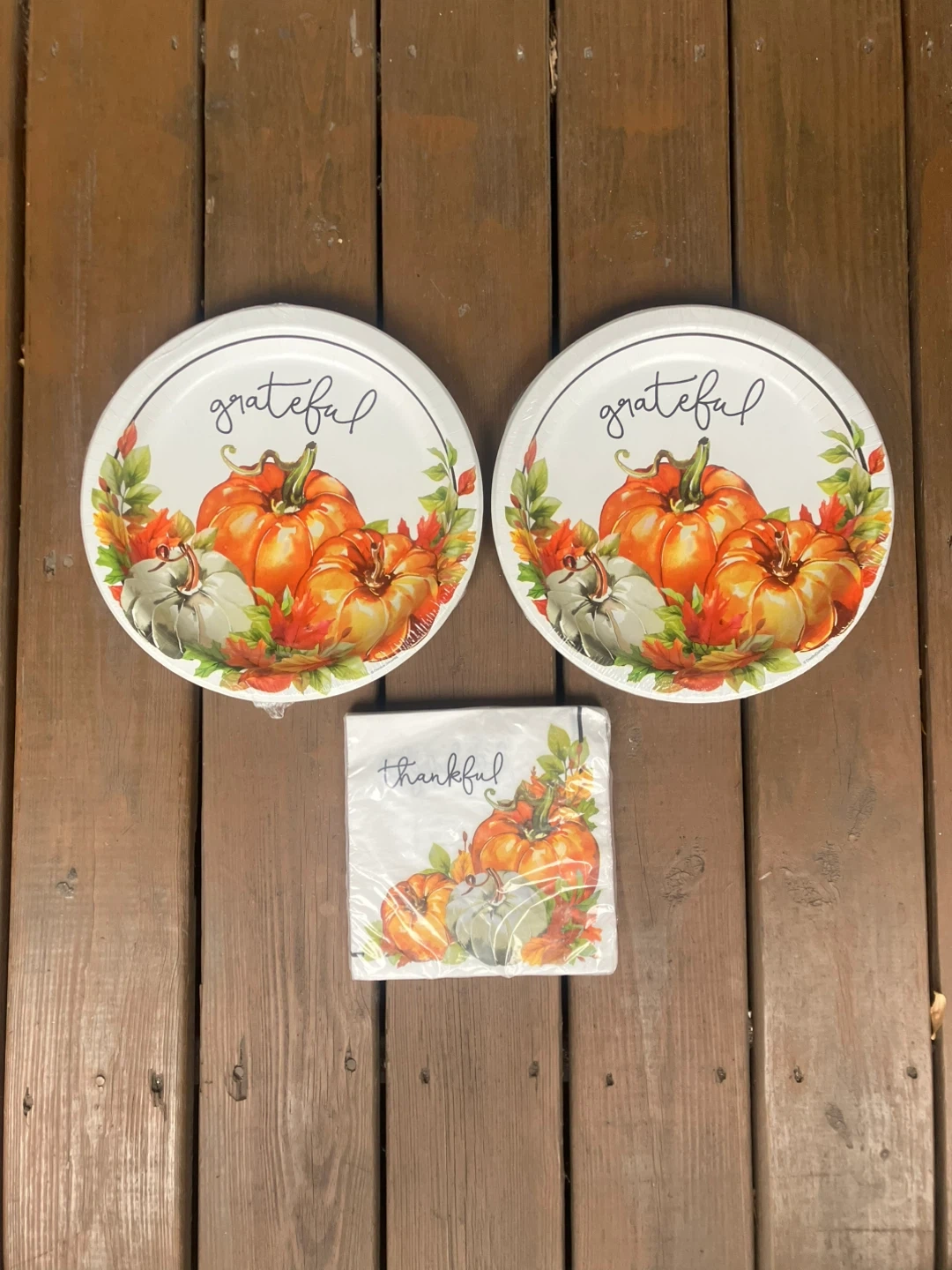 9416 Thanksgiving Plates - 20 Napkins - Brand New Two 8 count packages of sturdy paper plates measure 12” in diameter and have the word “grateful” over some pumpkins. I package of 20 napkins measure 15.6” when unfolded and have the word “thankful” over some pumpkins All items are brand new in the original packaging. From a smoke and pet free home. Check out in person before purchasing. Thanks for looking.
