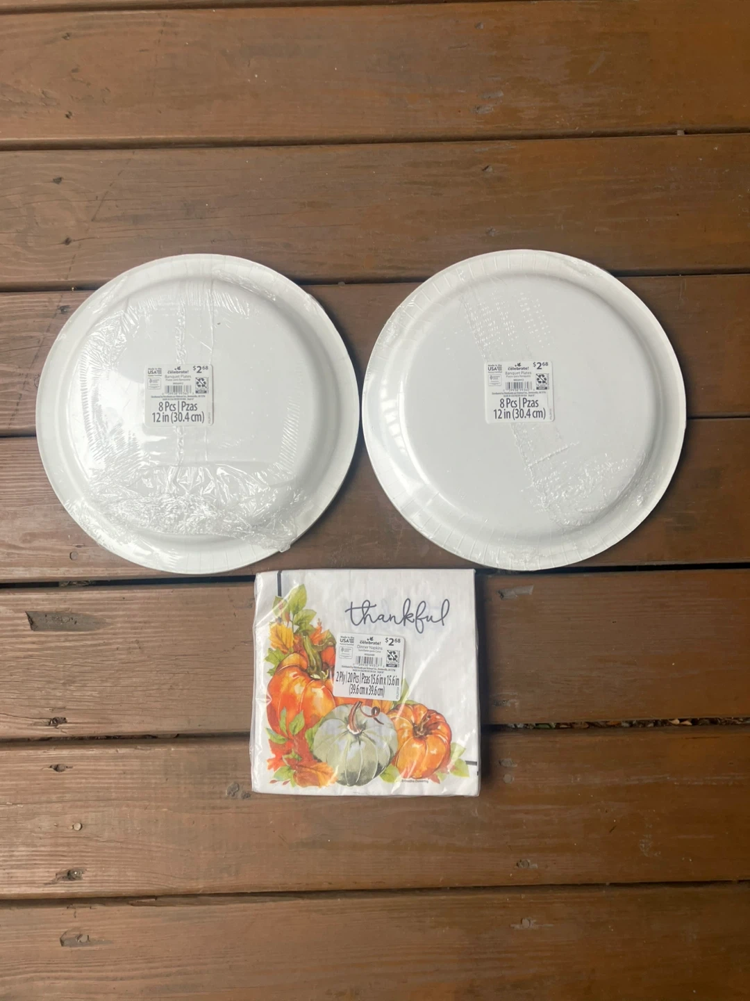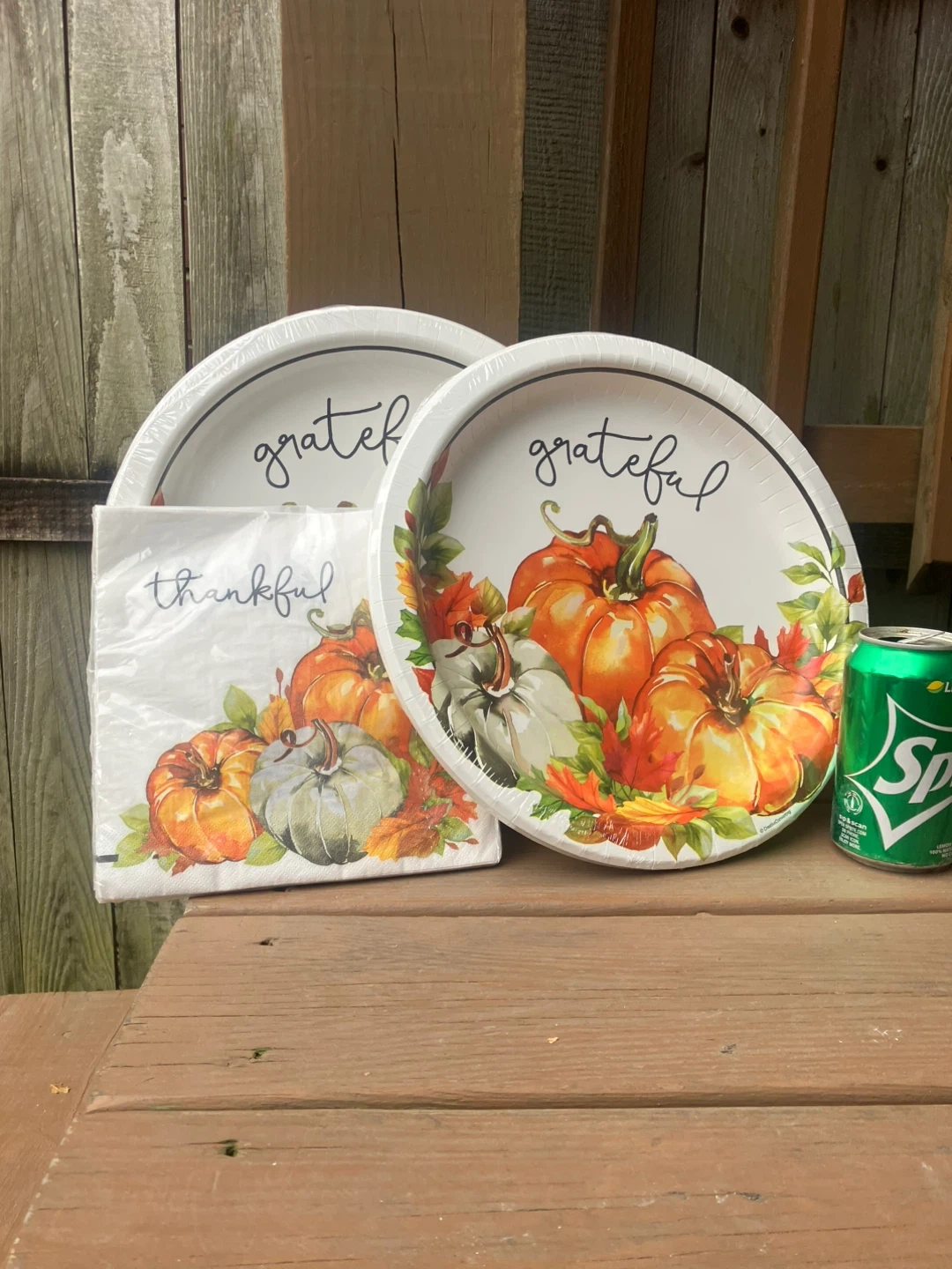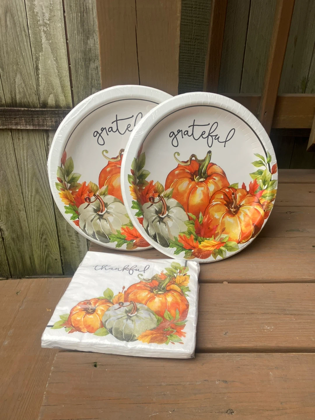 9416 Thanksgiving Plates - 20 Napkins - Brand New Two 8 count packages of sturdy paper plates measure 12” in diameter and have the word “grateful” over some pumpkins. I package of 20 napkins measure 15.6” when unfolded and have the word “thankful” over some pumpkins All items are brand new in the original packaging. From a smoke and pet free home. Check out in person before purchasing. Thanks for looking.