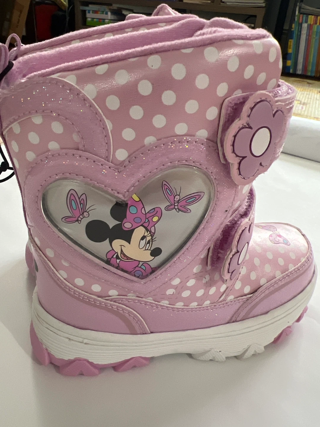 These adorable Minnie Mouse snow boots are perfect for keeping your little one's feet warm and dry! They feature a cute pink polka dot design with Minnie Mouse accents. Great for winter fun!