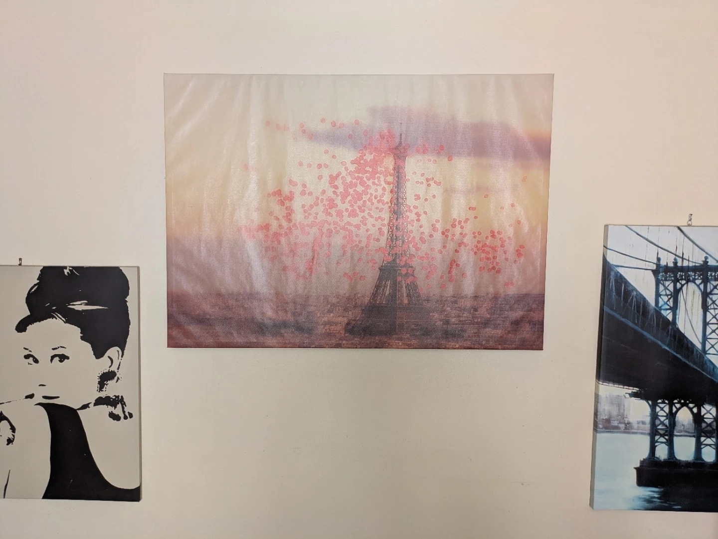 This canvas print features the Eiffel Tower with a soft, pink floral overlay. The artwork has a muted color palette with shades of pink, beige, and brown. It's a beautiful piece for home decor.