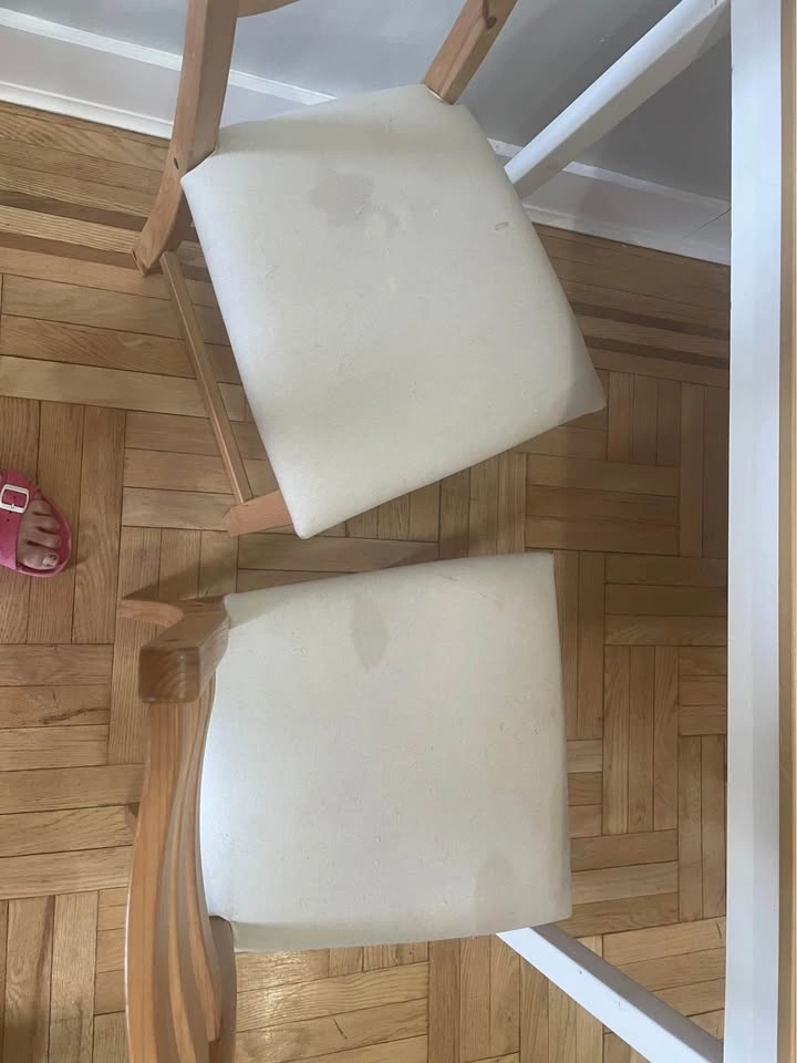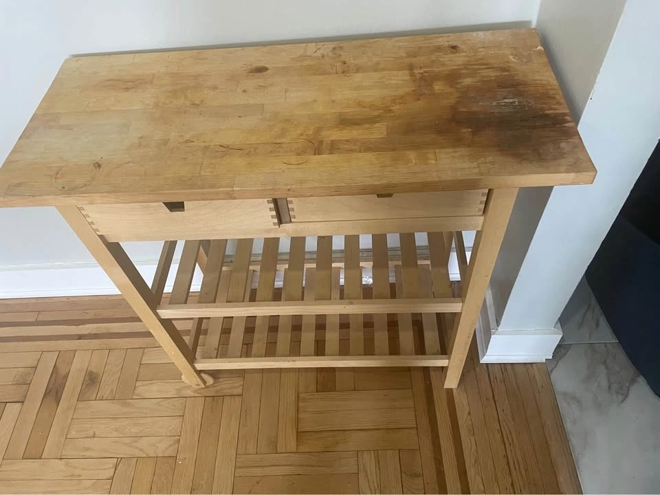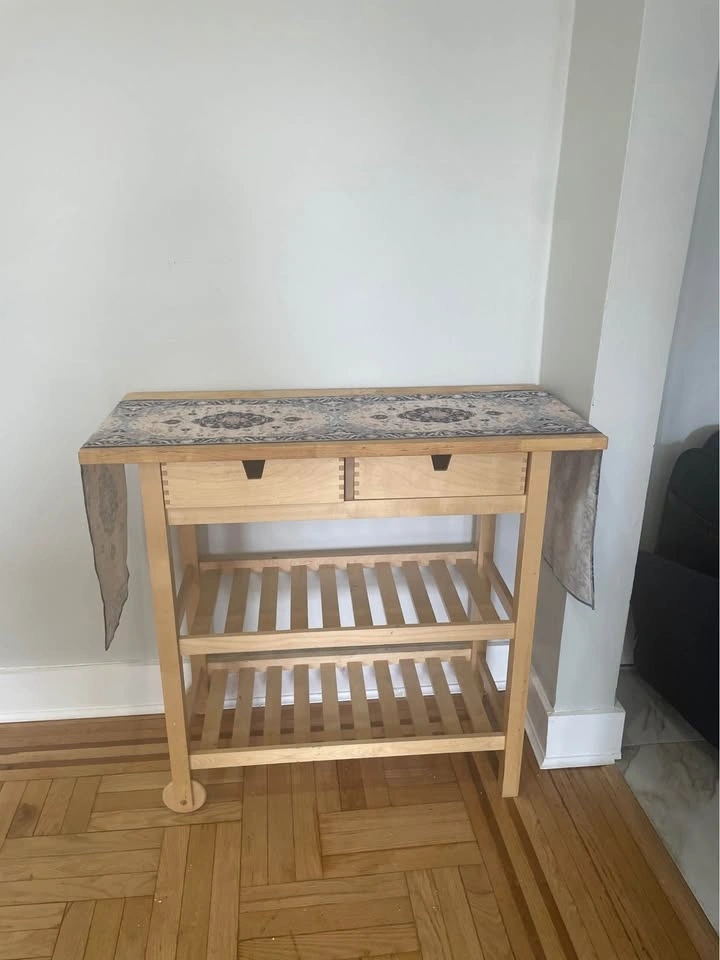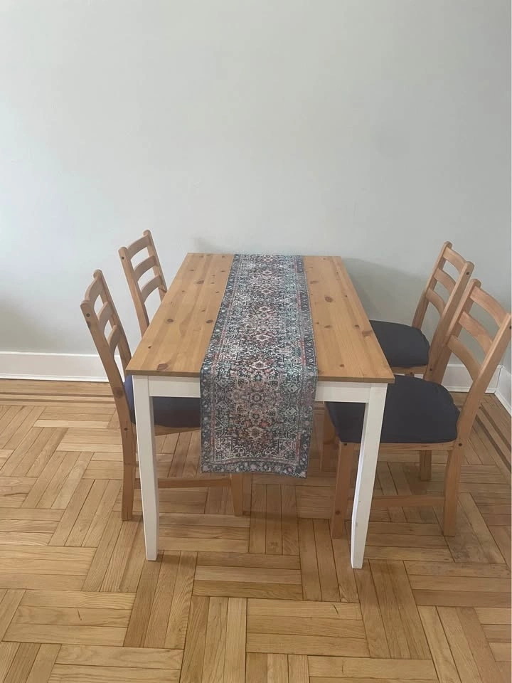 Complete dining and kitchen storage setup! Everything is solid wood and in great structural condition. Dining Set: IKEA LERHAMN Table with 4 matching chairs. Bonus Covers: two full sets of Navy Blue covers (8 covers total). Kitchen Cart: IKEA FÖRHÖJA birch island with two-way drawers. Perfect for extra prep space. (Note: countertop has some wear/staining). Extras: Blue table runners available for an additional $10. Elevator building - Pickup only.