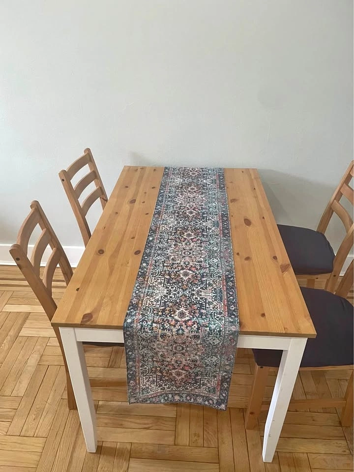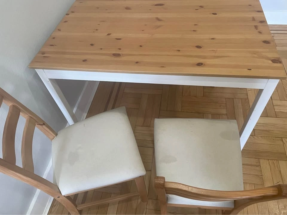 Complete dining and kitchen storage setup! Everything is solid wood and in great structural condition. Dining Set: IKEA LERHAMN Table with 4 matching chairs. Bonus Covers: two full sets of Navy Blue covers (8 covers total). Kitchen Cart: IKEA FÖRHÖJA birch island with two-way drawers. Perfect for extra prep space. (Note: countertop has some wear/staining). Extras: Blue table runners available for an additional $10. Elevator building - Pickup only.