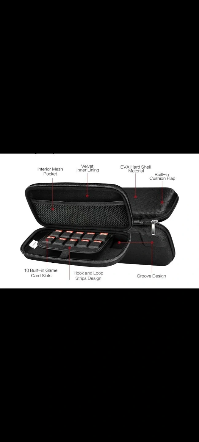 This storage case features an EVA hard shell with a velvet inner lining and interior mesh pocket. It includes 10 built-in game card slots and a hook and loop strips design. It also has a built-in cushion flap and groove design. Perfect for keeping your game cards organized and protected!