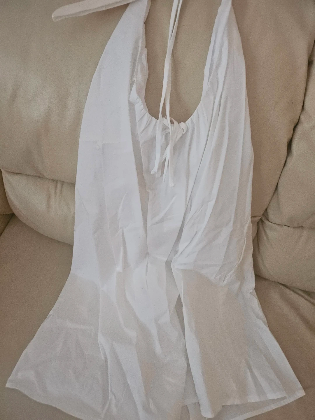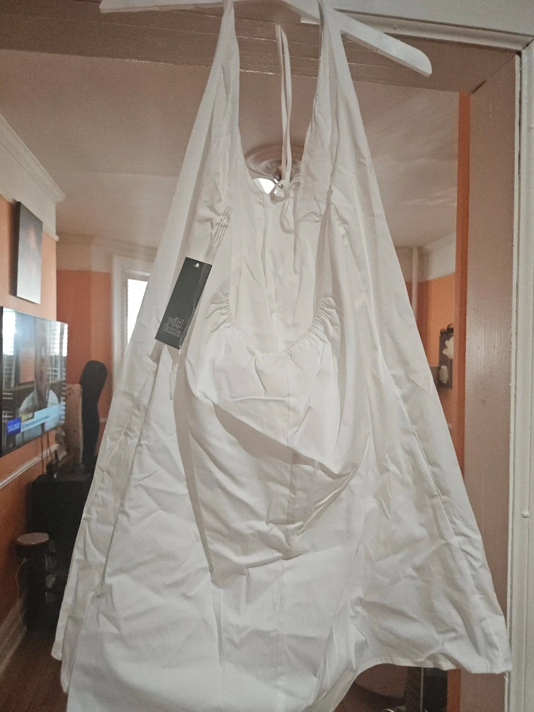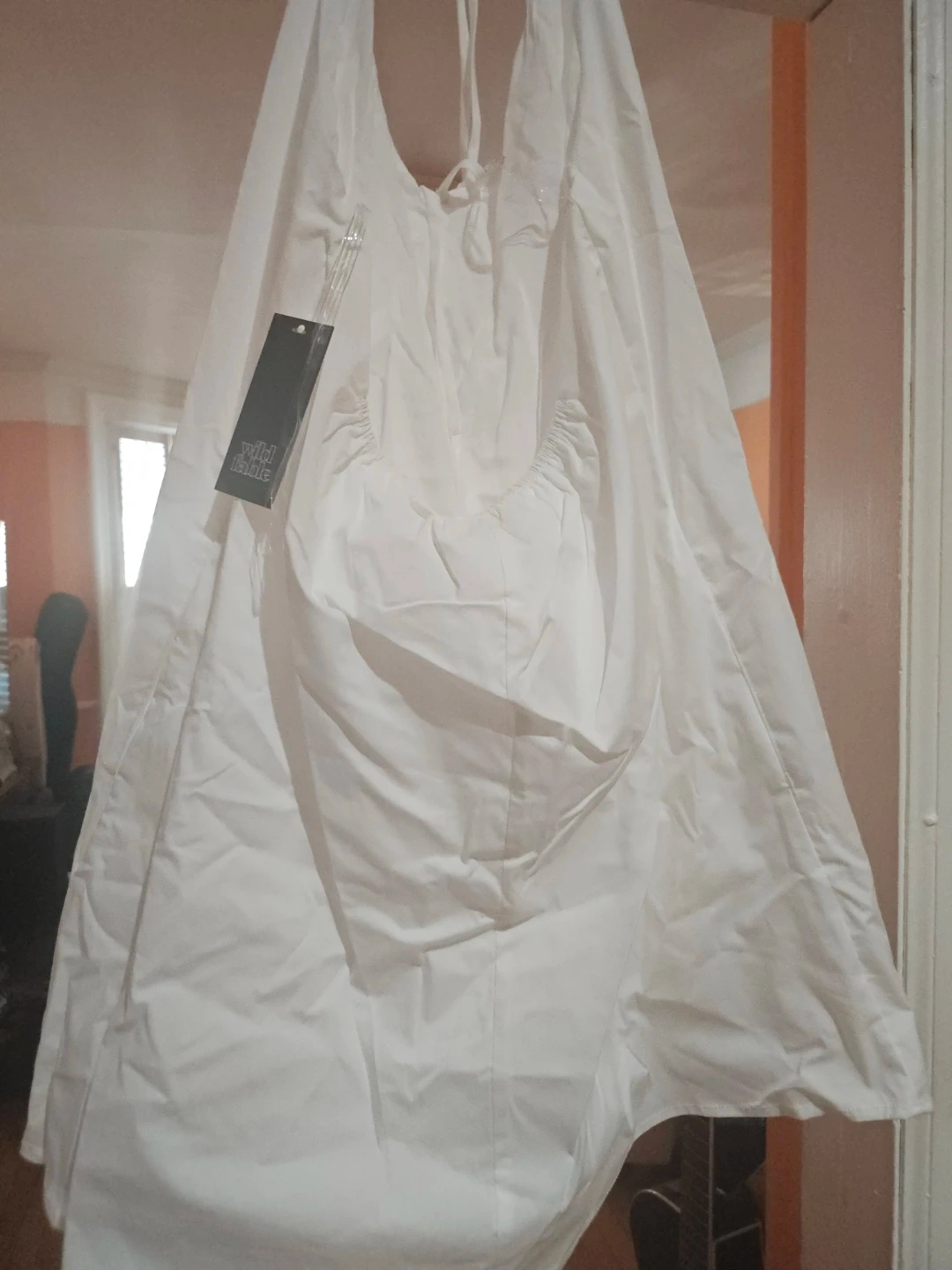 This is a Wild Fable white mini dress. It's a size small. The dress is made of cotton and has a halter neckline.