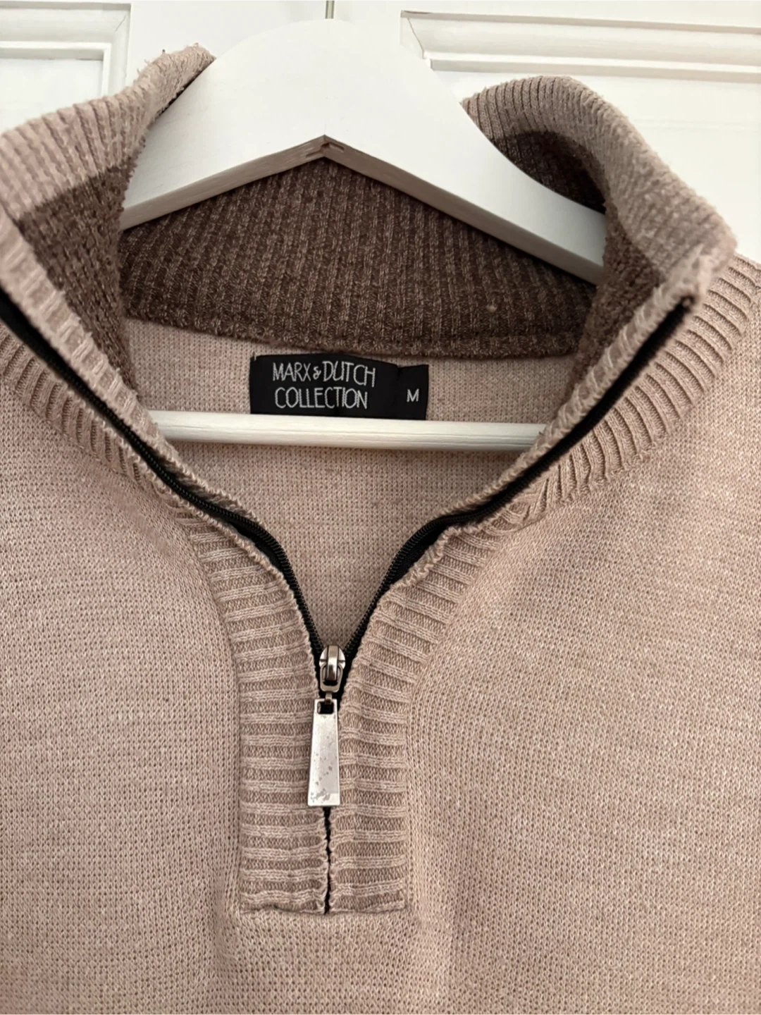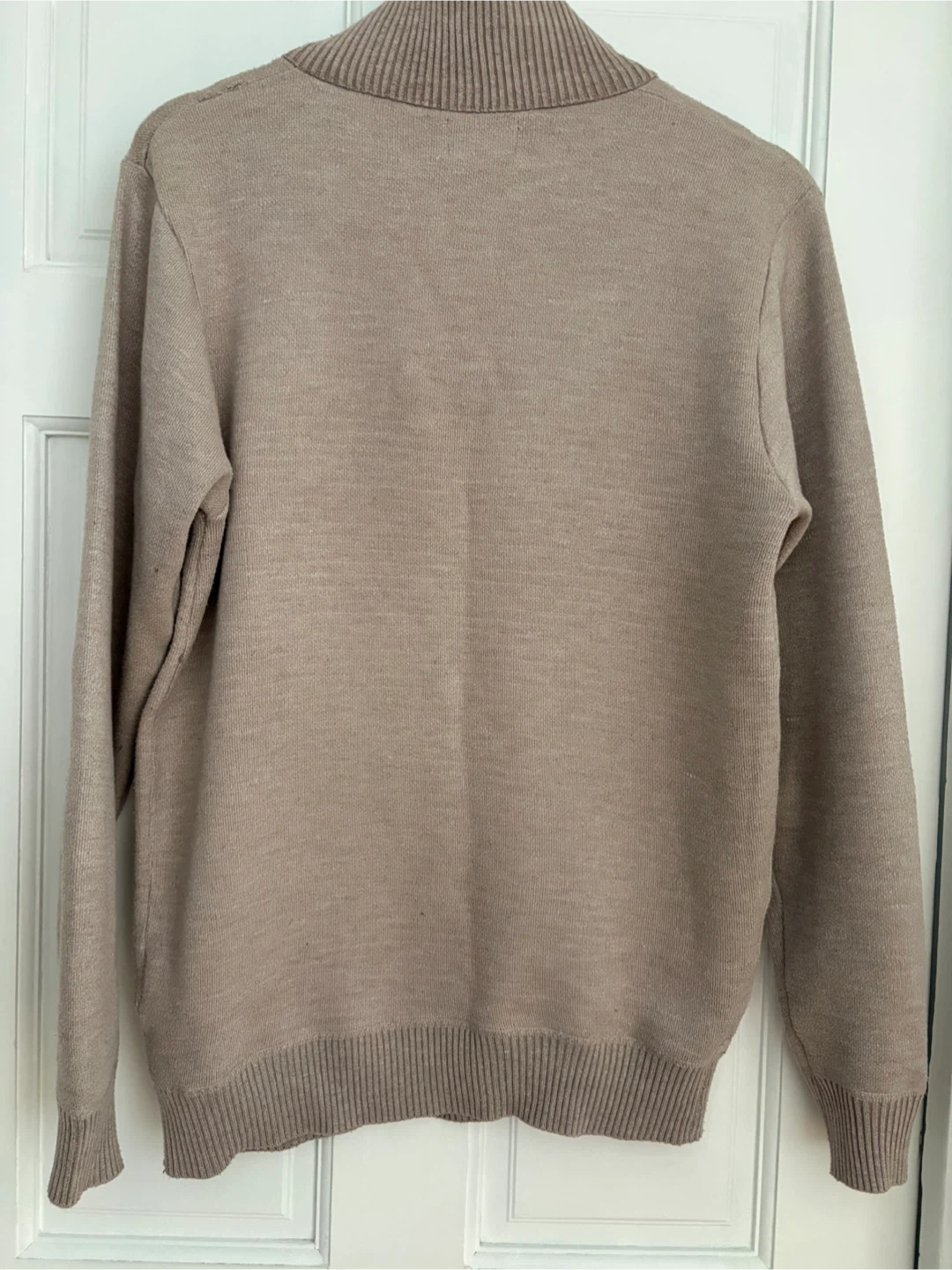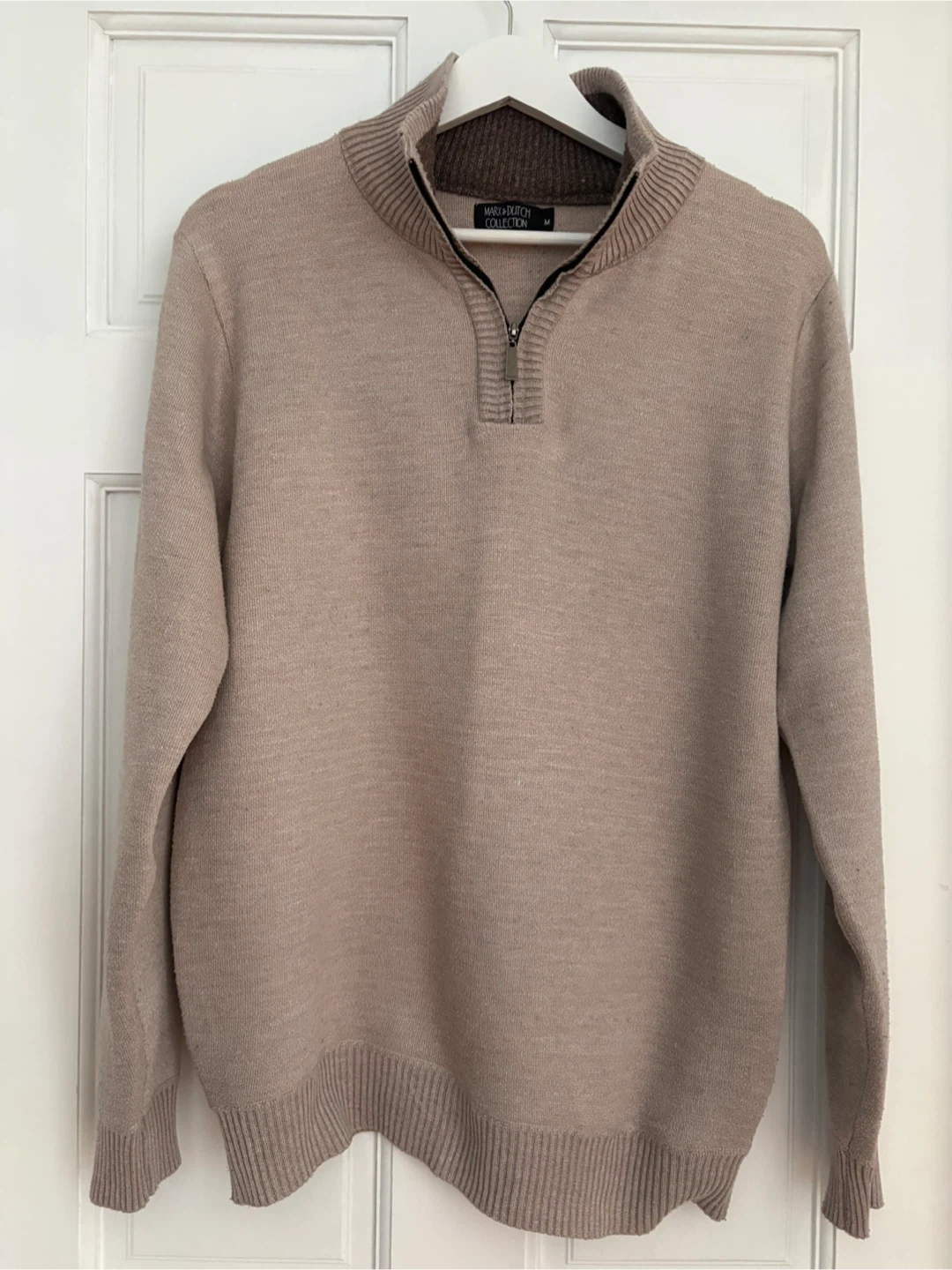 Features a quarter-zip neckline and a ribbed collar, cuffs, and hem. Neutral tan color.