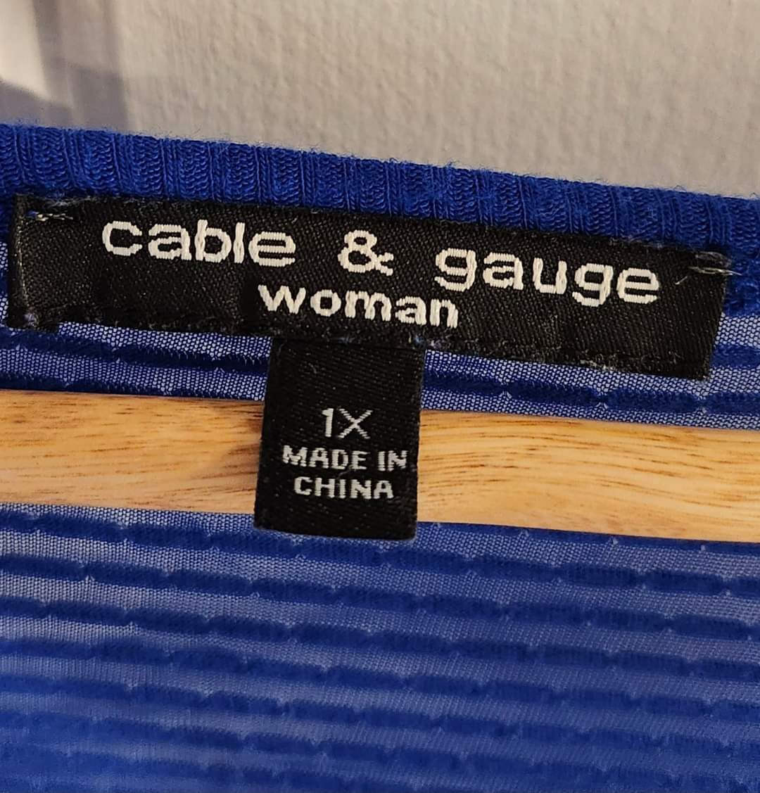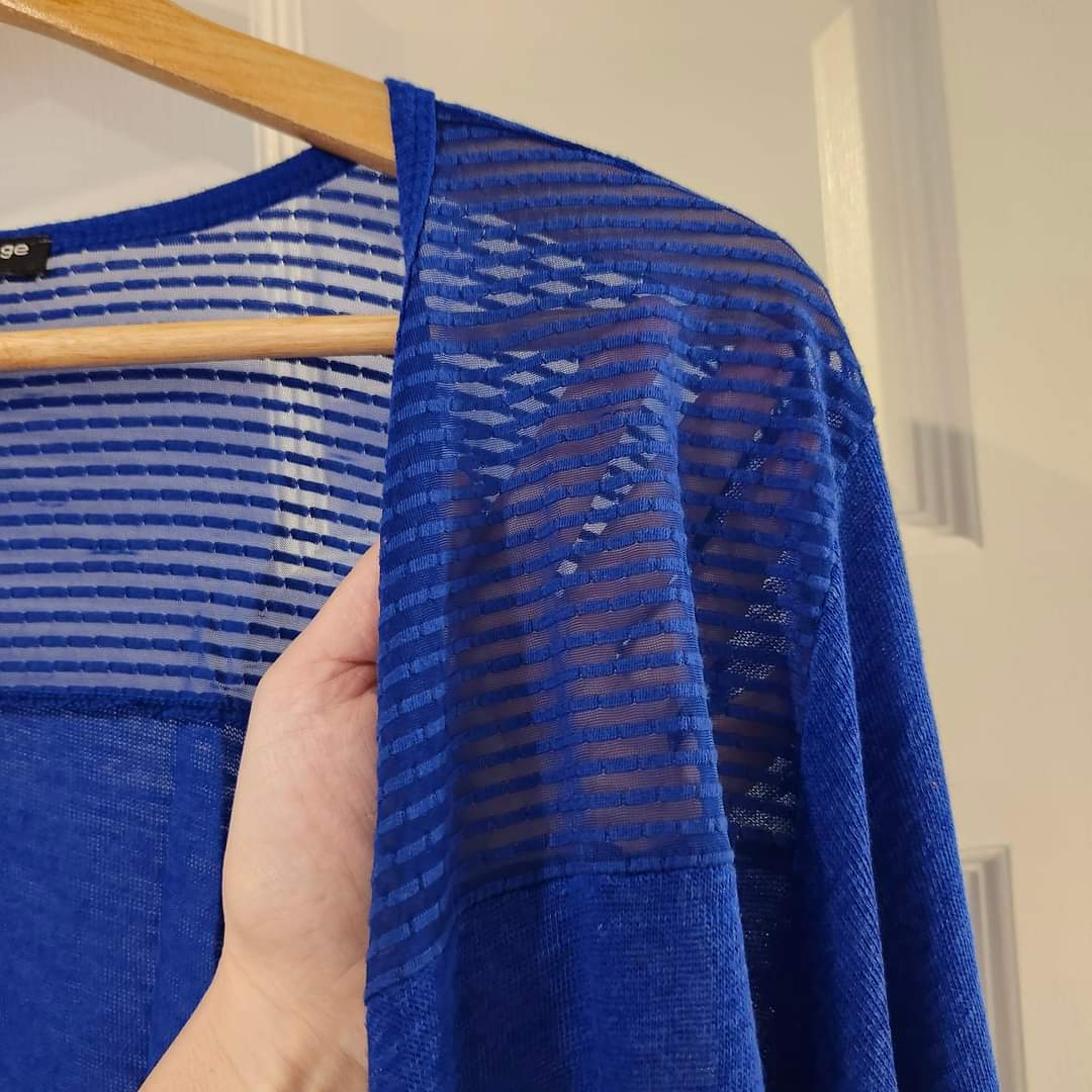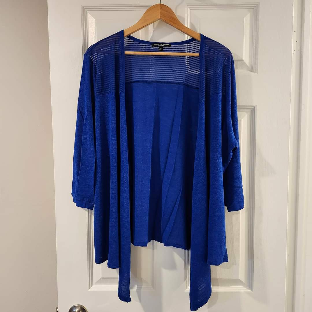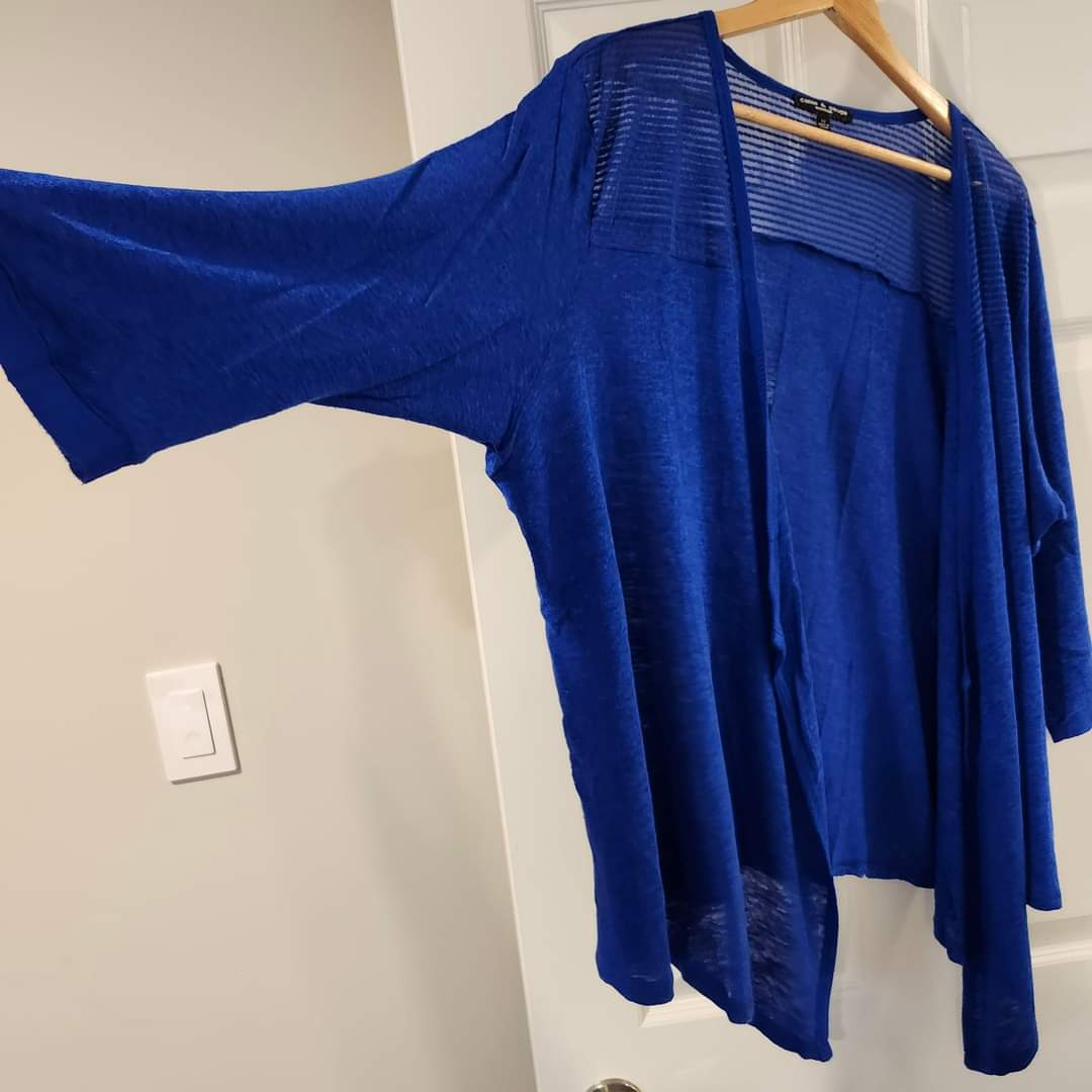 Like New CABLE and GAUGE. #1X Waterfall Open Cardigain, Royal Blue. 3/4 sleeves. Sheer Design across the shoulders at back & front. 52% LINEN, 48% viscose. The stripe/ sheer fabric is 63% Cotton, 38% polyester. 26" Pit to Pit, 26" Back Length $14 ~ Smoke & Pet Free Home. ~ Danforth & Victoria Park Ave. 🌞 Please check my other posts. Doing a massive wardrobe clearout from sizes XS to XXL
