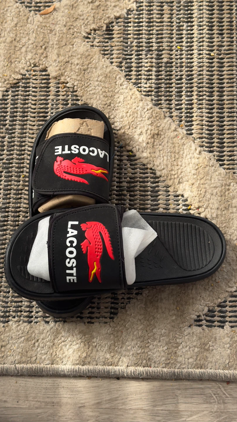 Selling a pair of Lacoste slides in black! They are size 7 and feature the iconic Lacoste crocodile logo in red. Perfect for casual wear!