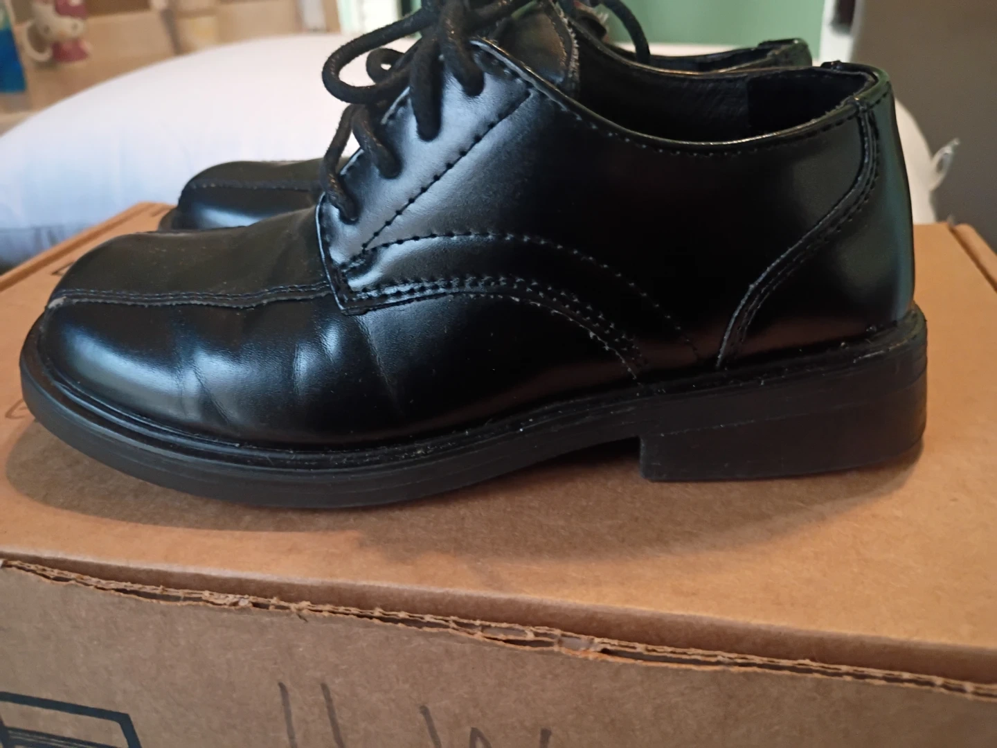 These are GABE brand dress shoes in black. The upper is made of simulated leather. They're a kids size 11 wide. These shoes are great for formal occasions or school uniforms!
