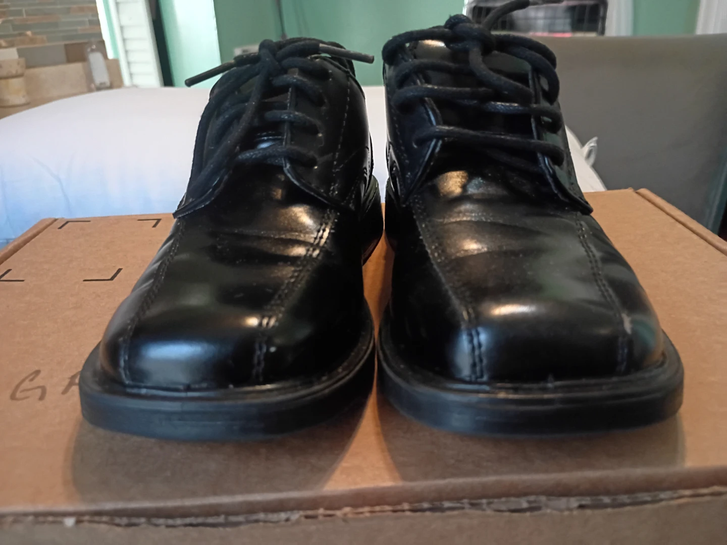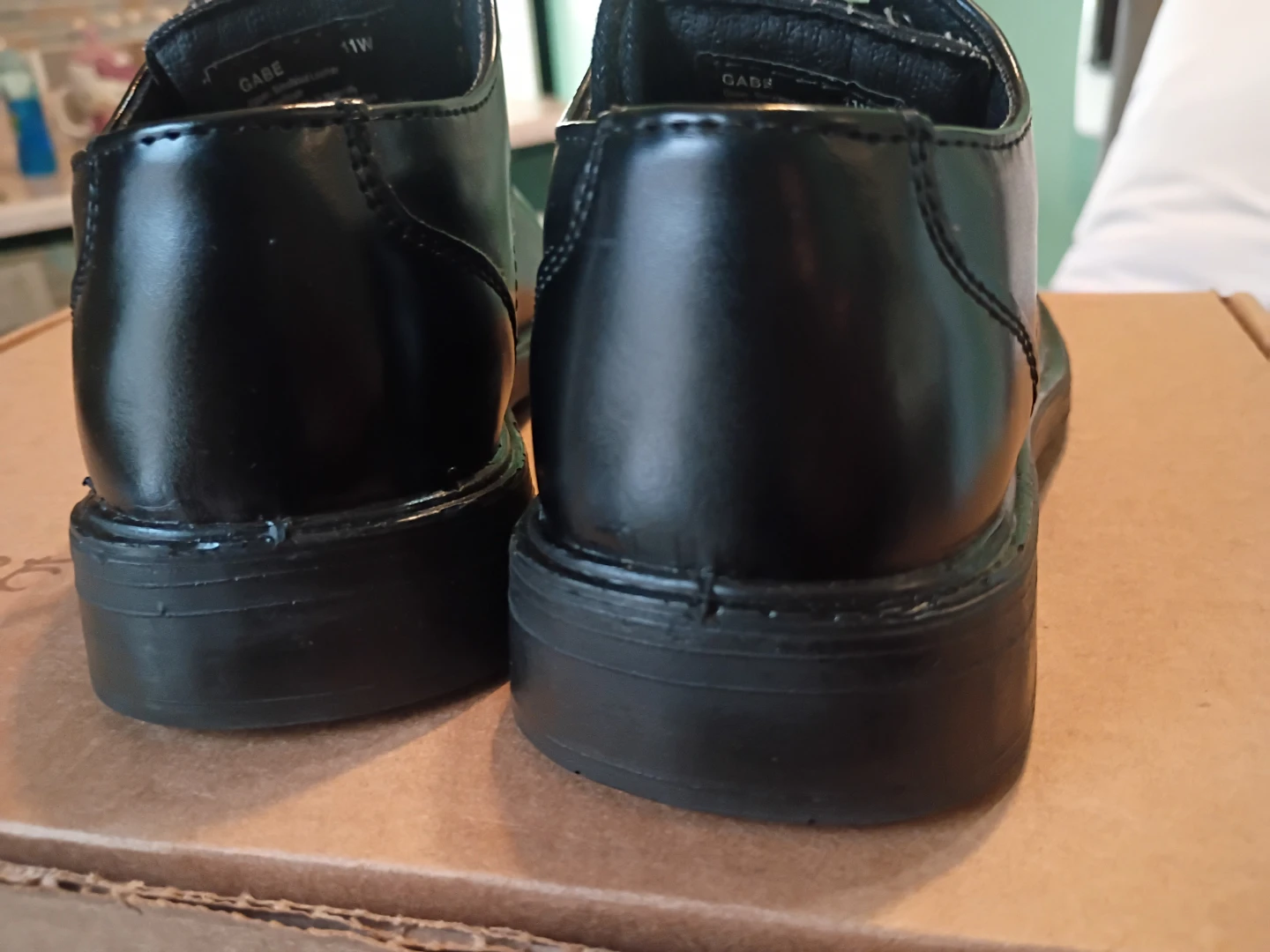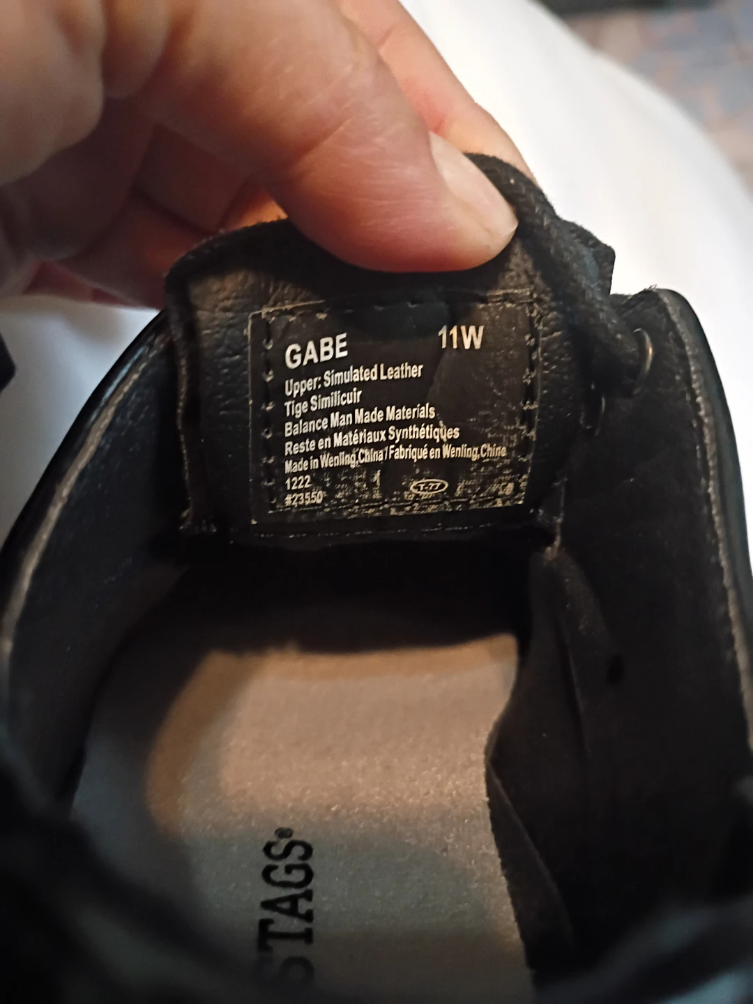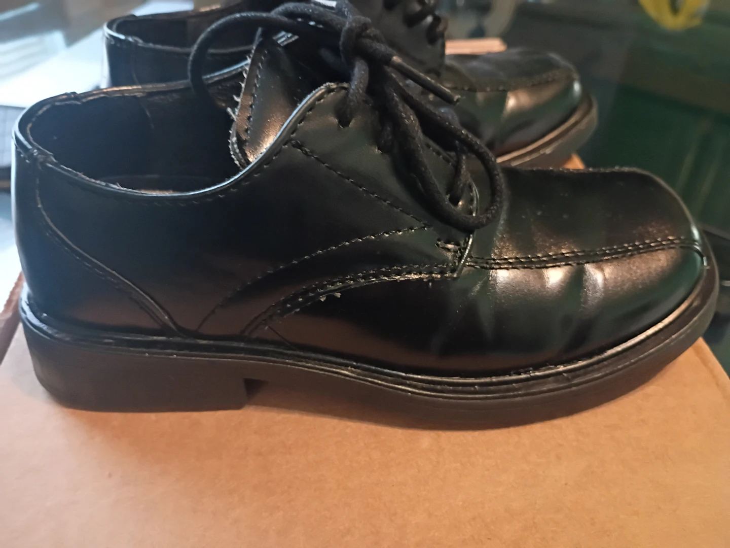 These are GABE brand dress shoes in black. The upper is made of simulated leather. They're a kids size 11 wide. These shoes are great for formal occasions or school uniforms!